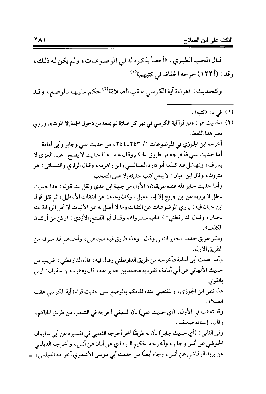 وكحديث قِرَاءَة آيَة الْكُرْسِيّ عقب الصَّلَاة حكم عَلَيْهَا بِالْوَضْعِ وَقد