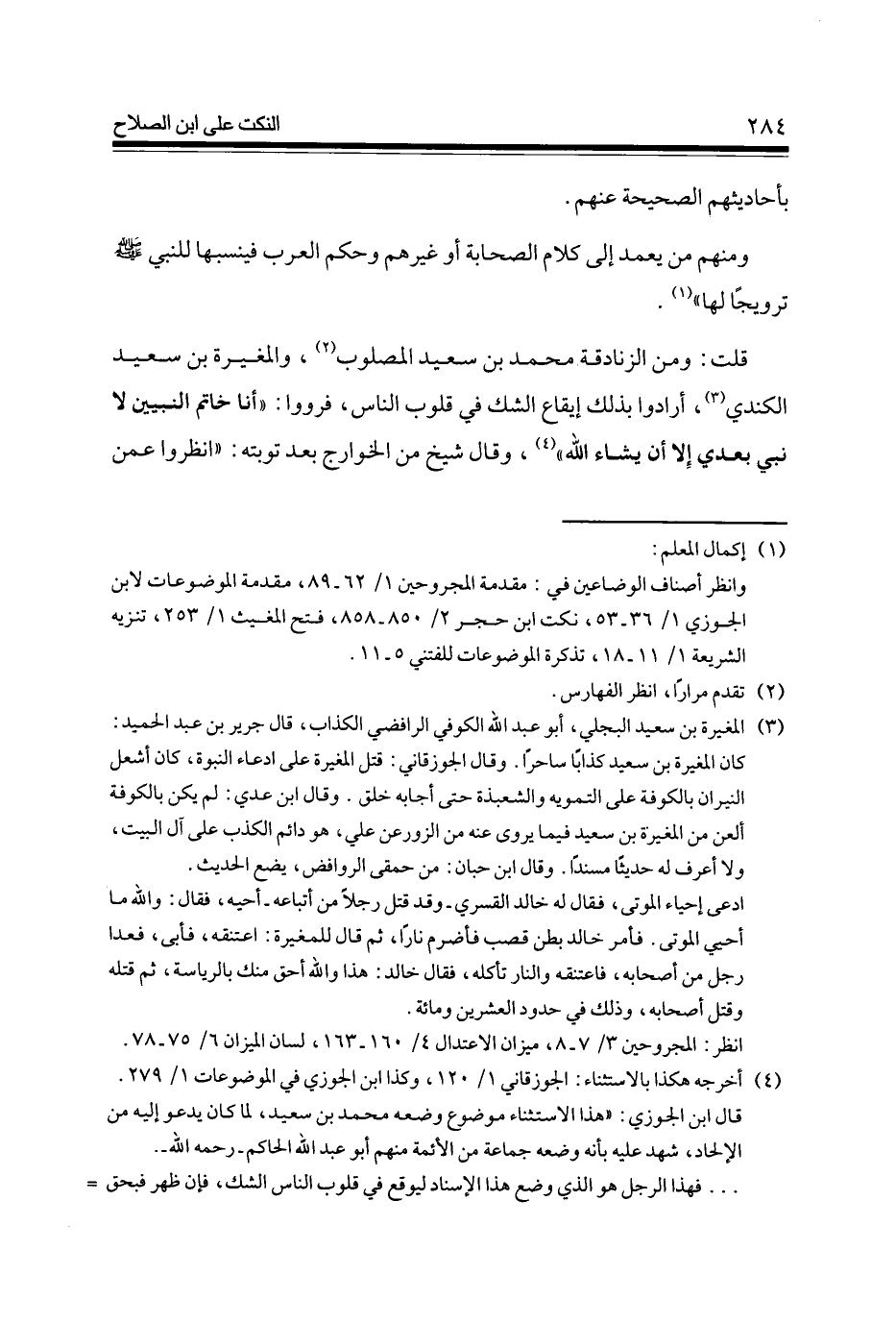 قلت وَمن الزَّنَادِقَة مُحَمَّد بن سعيد المصلوب والمغيرة بن سعيد الْكِنْدِيّ أَرَادوا بذلك إِيقَاع الشَّك فِي قُلُوب النَّاس فرووا أَنا خَاتم النَّبِيين لَا نَبِي بعدِي إِلَّا أَن يَشَاء الله وَقَالَ شيخ من الْخَوَارِج بعد تَوْبَته أنظروا عَمَّن