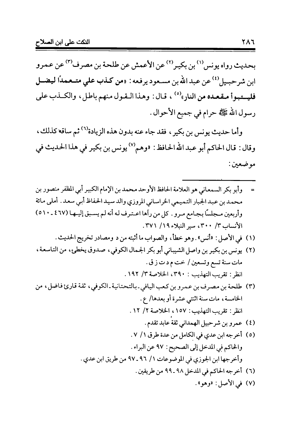 بِحَدِيث رَوَاهُ يُونُس بن بكير عَن الْأَعْمَش عَن طَلْحَة بن مصرف عَن عَمْرو ابْن شُرَحْبِيل عَن عبد الله بن مَسْعُود يرفعهُ من كذب عَليّ مُتَعَمدا ليضل فَليَتَبَوَّأ مَقْعَده من النَّار قَالَ وَهَذَا القَوْل مِنْهُم بَاطِل وَالْكذب على رَسُول الله صلى الله عَلَيْهِ وَسلم حرَام فِي جَمِيع الْأَحْوَال