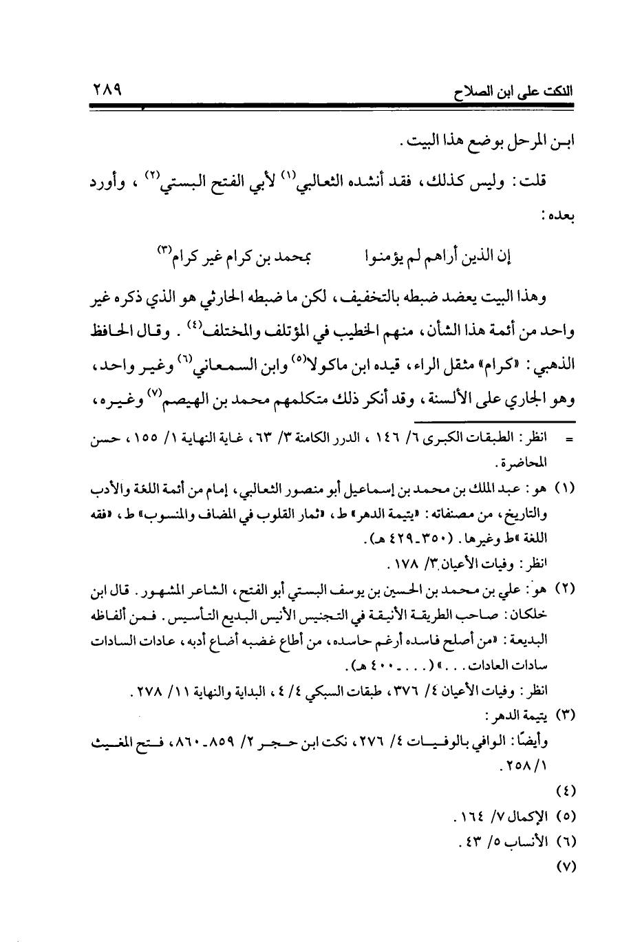 وَهَذَا الْبَيْت يعضد ضَبطه بِالتَّخْفِيفِ لَكِن مَا ضَبطه الْحَارِثِيّ هُوَ الَّذِي ذكره غير وَاحِد من أَئِمَّة هَذَا الشَّأْن مِنْهُم الْخَطِيب فِي المؤتلف والمختلف وَقَالَ الْحَافِظ الذَّهَبِيّ كرام مثقل الرَّاء قَيده ابْن مَاكُولَا وَابْن السَّمْعَانِيّ وَغير وَاحِد وَهُوَ الْجَارِي على الْأَلْسِنَة وَقد أنكر ذَلِك متكلمهم مُحَمَّد بن الهيصم وَغَيره