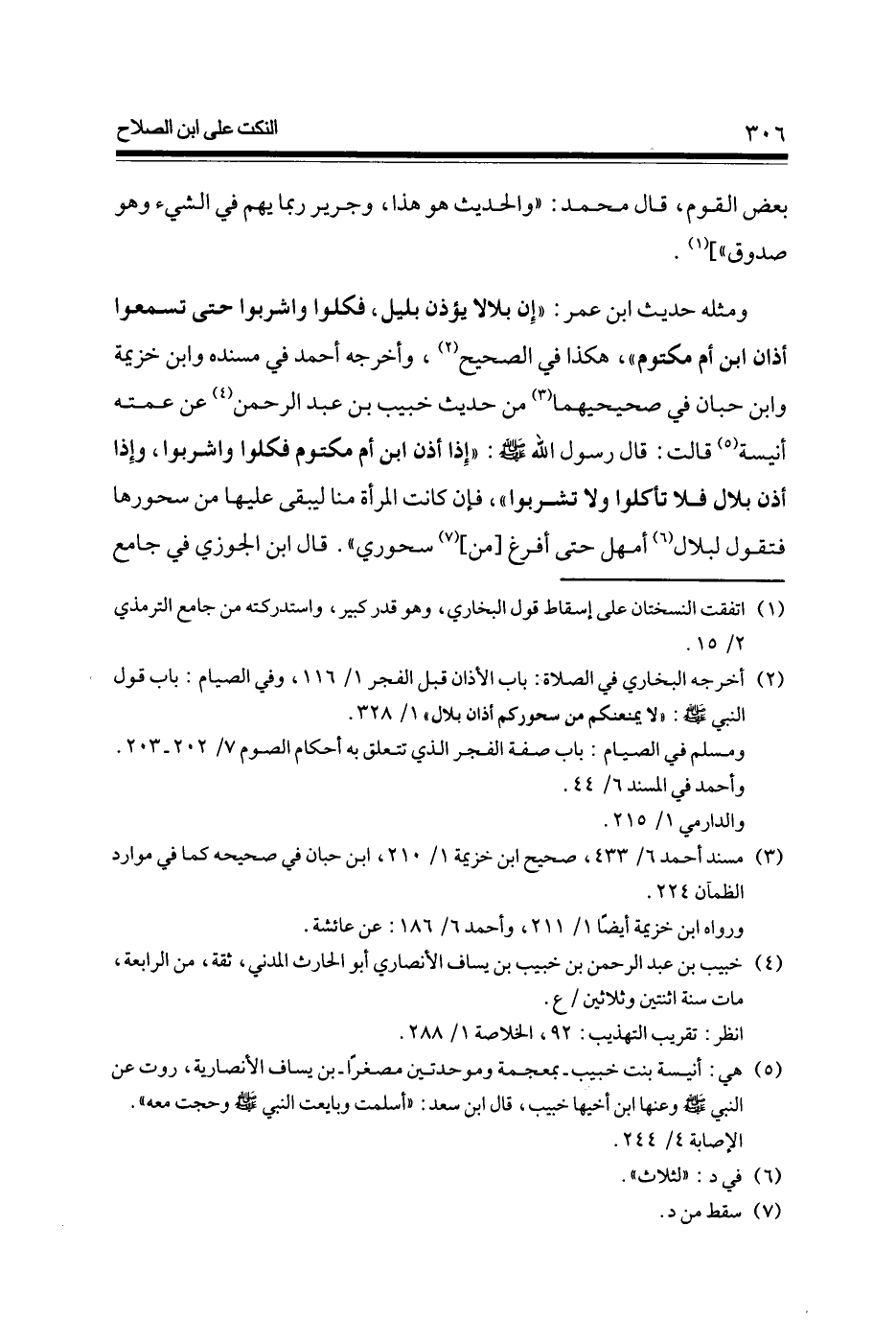 وَمثله حَدِيث ابْن عمر إِن بِلَالًا يُؤذن بلَيْل فَكُلُوا وَاشْرَبُوا حَتَّى تسمعوا أَذَان ابْن أم مَكْتُوم هَكَذَا فِي الصَّحِيح وَأخرجه أَحْمد فِي مُسْنده وَابْن خُزَيْمَة وَابْن حبَان فِي صَحِيحَيْهِمَا من حَدِيث خبيب بن عبد الرَّحْمَن عَن عمته أنيسَة قَالَت قَالَ رَسُول الله صلى الله عَلَيْهِ وَسلم إِذا أذن ابْن أم مَكْتُوم فَكُلُوا وَاشْرَبُوا وَإِذا أذن بِلَال فَلَا تَأْكُلُوا وَلَا تشْربُوا فَإِن كَانَت الْمَرْأَة منا ليبقى عَلَيْهَا من سحورها فَتَقول لِبلَال أمْهل حَتَّى أفرغ [من] سحوري قَالَ ابْن الْجَوْزِيّ فِي جَامع