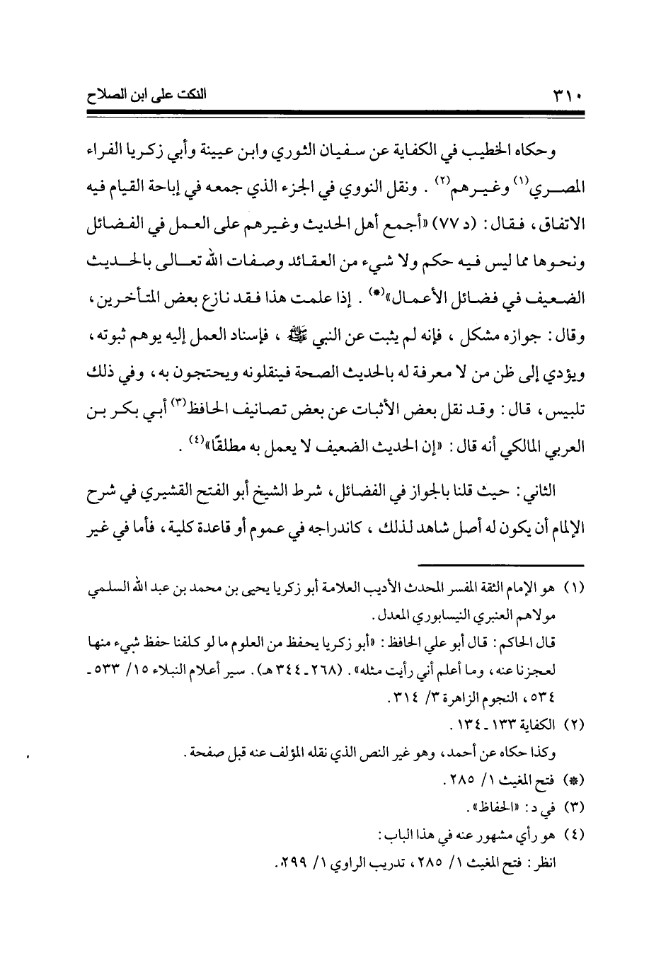 وَحَكَاهُ الْخَطِيب فِي الْكِفَايَة عَن سُفْيَان الثَّوْريّ وَابْن عُيَيْنَة وَأبي زَكَرِيَّا الْفراء الْمصْرِيّ وَغَيرهم وَنقل النَّوَوِيّ فِي الْجُزْء الَّذِي جمعه فِي إِبَاحَة الْقيام فِيهِ الِاتِّفَاق فَقَالَ (د 77) أجمع أهل الحَدِيث وَغَيرهم على الْعَمَل فِي الْفَضَائِل وَنَحْوهَا مِمَّا لَيْسَ فِيهِ حكم وَلَا شَيْء من العقائد وصفات الله تَعَالَى بِالْحَدِيثِ الضَّعِيف فِي فَضَائِل الْأَعْمَال إِذا علمت هَذَا فقد نَازع بعض الْمُتَأَخِّرين وَقَالَ جَوَازه مُشكل فَإِنَّهُ لم يثبت عَن النَّبِي صلى الله عَلَيْهِ وَسلم فإسناد الْعَمَل إِلَيْهِ يُوهم ثُبُوته وَيُؤَدِّي إِلَى ظن من لَا معرفَة لَهُ بِالْحَدِيثِ الصِّحَّة فينقلونه ويحتجون بِهِ وَفِي ذَلِك تلبيس قَالَ وَقد نقل بعض الْأَثْبَات عَن بعض تصانيف الْحَافِظ أبي بكر بن الْعَرَبِيّ الْمَالِكِي أَنه قَالَ إِن الحَدِيث الضَّعِيف لَا يعْمل بِهِ مُطلقًا
