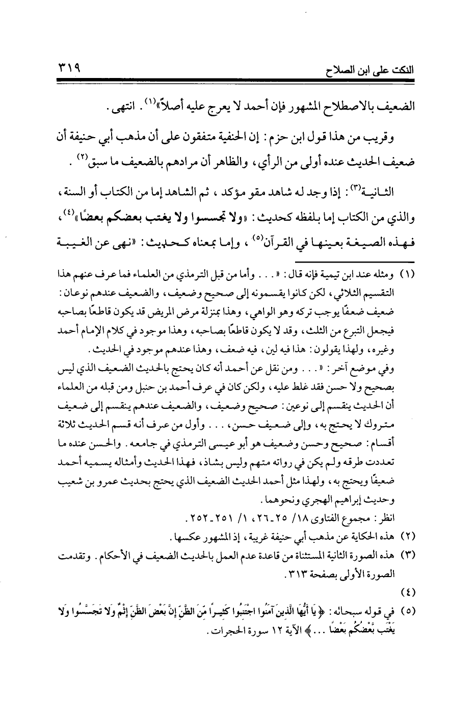 وَقَرِيب من هَذَا قَول ابْن حزم إِن الْحَنَفِيَّة متفقون على أَن مَذْهَب أبي حنيفَة أَن ضَعِيف الحَدِيث عِنْده أولى من الرَّأْي وَالظَّاهِر أَن مُرَادهم بالضعيف مَا سبق