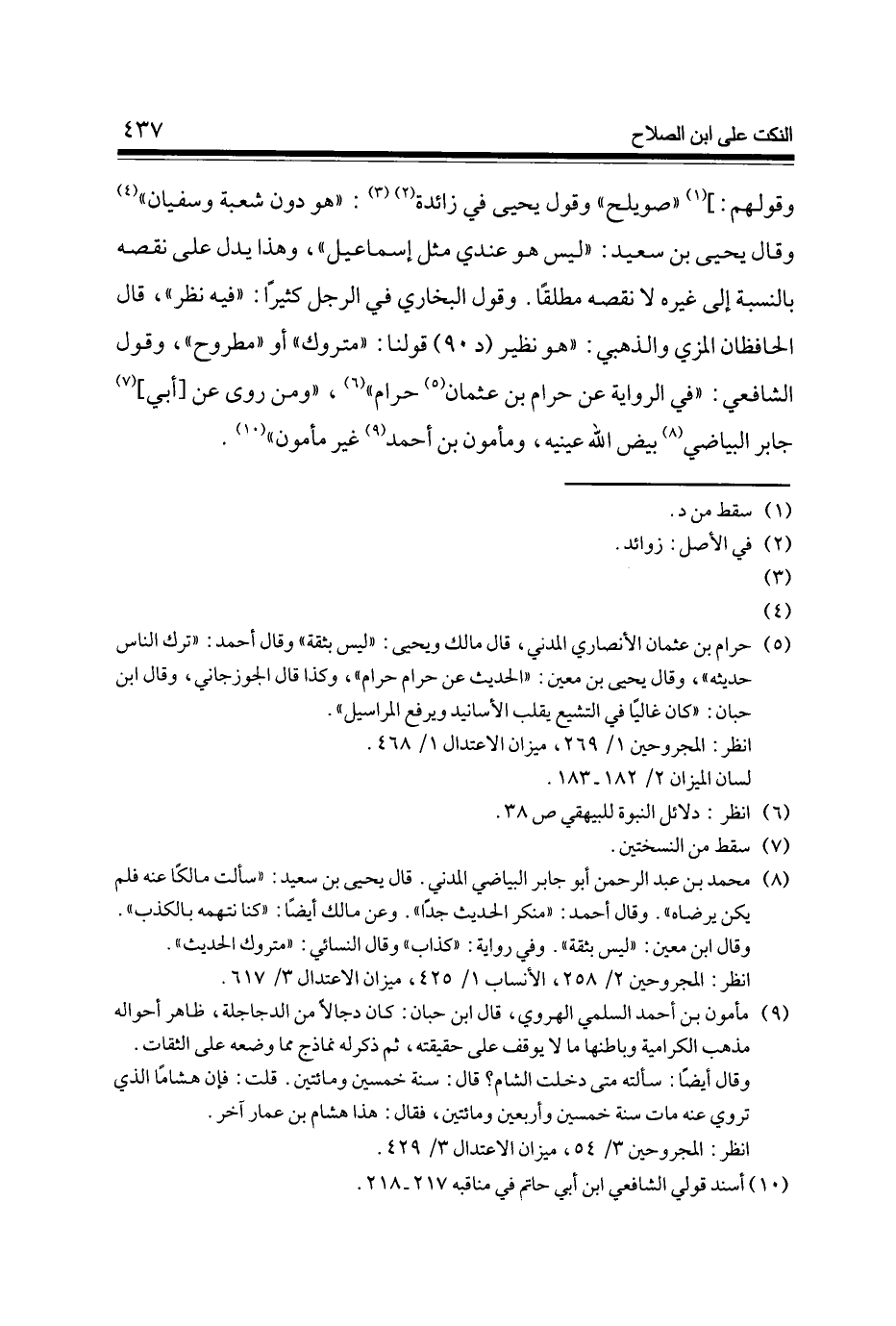 وَقَوْلهمْ] (1) صُوَيْلِح وَقَول يحيى فِي زَائِدَة (2) (3) هُوَ دون شُعْبَة وسُفْيَان (4) وَقَالَ يحيى بن سعيد لَيْسَ هُوَ عِنْدِي مثل إِسْمَاعِيل وَهَذَا يدل على نَقصه بِالنِّسْبَةِ إِلَى غَيره لَا نَقصه مُطلقًا وَقَول البُخَارِيّ فِي الرجل كثيرا فِيهِ نظر قَالَ الحافظان الْمزي والذهبي هُوَ نَظِير (د 90) قَوْلنَا مَتْرُوك أَو مطروح وَقَول الشَّافِعِي فِي الرِّوَايَة عَن حرَام بن عُثْمَان (5) حرَام (6) وَمن روى عَن [أبي] (7) جَابر البياضي (8) بيض الله عَيْنَيْهِ ومأمون بن أَحْمد (9) غير مَأْمُون (10)