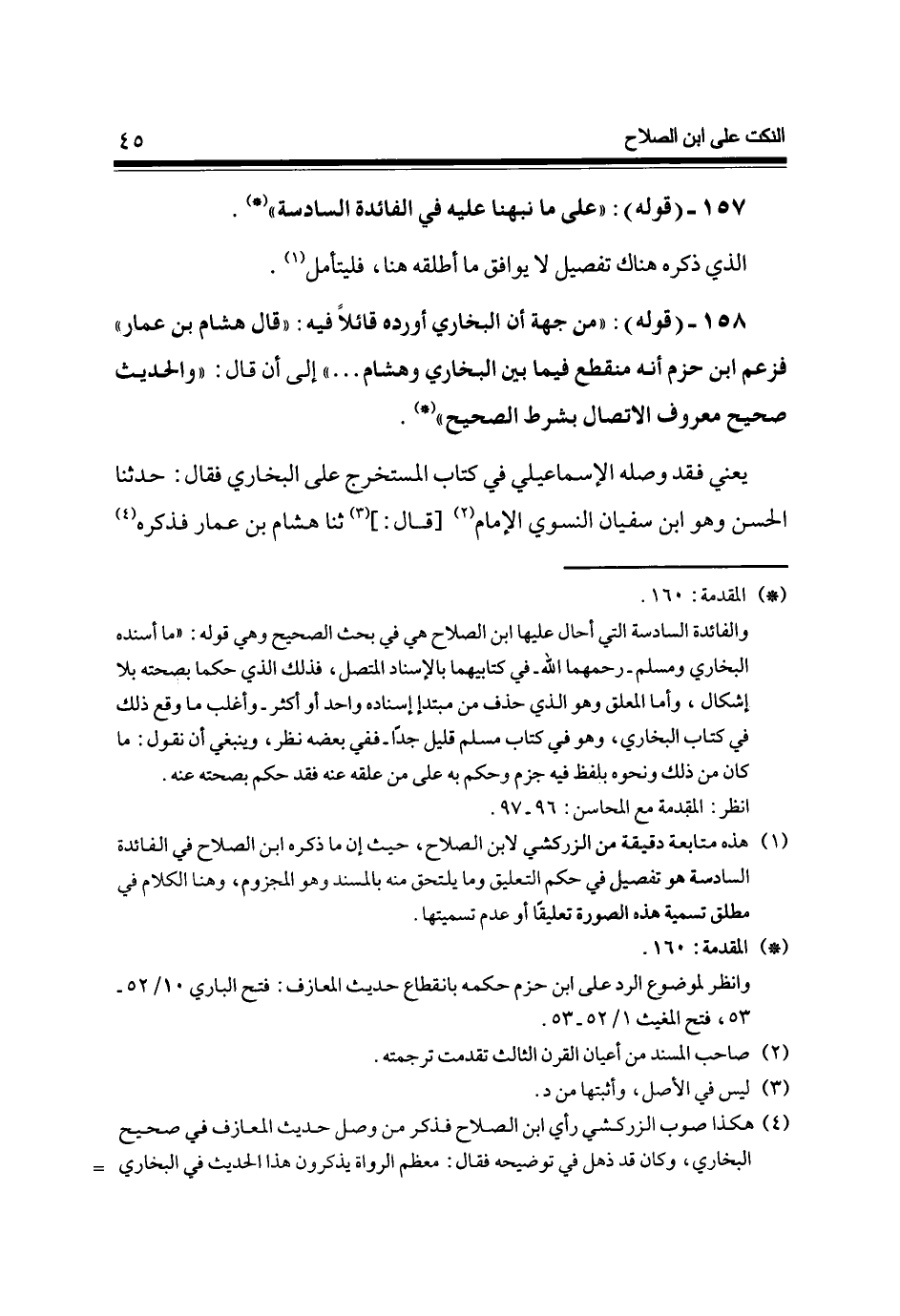 158 - (قَوْله) من جِهَة أَن البُخَارِيّ أوردهُ قَائِلا فِيهِ قَالَ هِشَام بن عمار فَزعم ابْن حزم أَنه مُنْقَطع فِيمَا بَين البُخَارِيّ وَهِشَام إِلَى أَن قَالَ والْحَدِيث صَحِيح مَعْرُوف الِاتِّصَال بِشَرْط الصَّحِيح