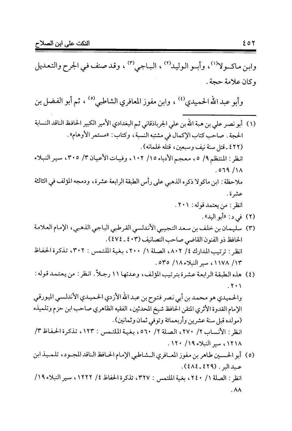 وَابْن مَاكُولَا (1) وَأَبُو الْوَلِيد (2) الْبَاجِيّ (3) وَقد صنف فِي الْجرْح وَالتَّعْدِيل وَكَانَ عَلامَة حجَّة