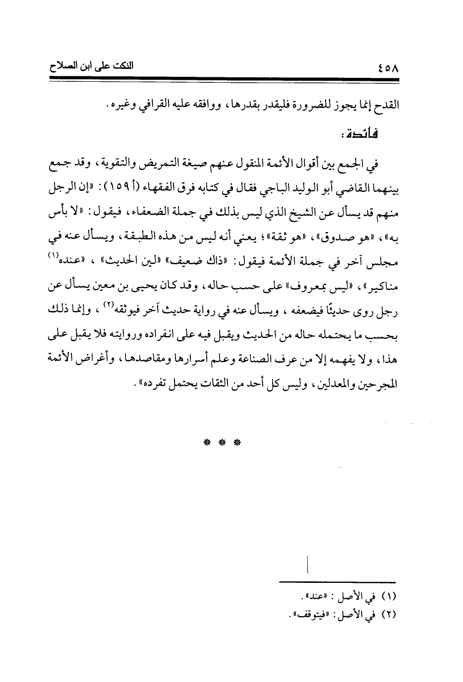 فِي الْجمع بَين أَقْوَال الْأَئِمَّة الْمَنْقُول عَنْهُم صِيغَة التمريض والتقوية وَقد جمع بَينهمَا القَاضِي أَبُو الْوَلِيد الْبَاجِيّ فَقَالَ فِي كِتَابه فرق الْفُقَهَاء (أ 159) إِن الرجل مِنْهُم قد يسْأَل عَن الشَّيْخ الَّذِي لَيْسَ بذلك فِي جملَة الضُّعَفَاء فَيَقُول لَا باس بِهِ هُوَ صَدُوق هُوَ ثِقَة يَعْنِي أَنه لَيْسَ من هَذِه الطَّبَقَة وَيسْأل عَنهُ فِي مجْلِس آخر فِي جملَة الْأَئِمَّة فَيَقُول ذَاك ضَعِيف لين الحَدِيث عِنْده مَنَاكِير (1) لَيْسَ بِمَعْرُوف على حسب حَاله وَقد كَانَ يحيى بن معِين يسْأَل عَن رجل روى حَدِيثا فيضعفه وَيسْأل عَنهُ فِي رِوَايَة حَدِيث آخر فيوثقه (2) وَإِنَّمَا ذَلِك بِحَسب مَا يحْتَملهُ حَاله من الحَدِيث وَيقبل فِيهِ على انْفِرَاده وَرِوَايَته فَلَا يقبل على هَذَا وَلَا يفهمهُ إِلَّا من عرف الصِّنَاعَة وَعلم أسرارها ومقاصدها وأغراض الْأَئِمَّة المجرحين والمعدلين وَلَيْسَ كل أحد من الثِّقَات يحْتَمل تفرده