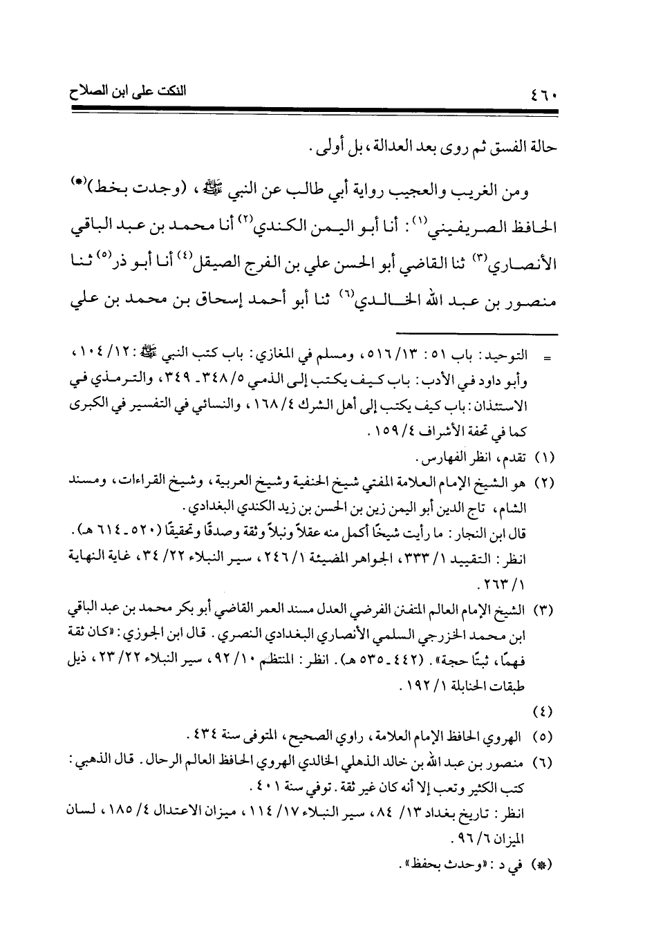 وَمن الْغَرِيب والعجيب رِوَايَة أبي طَالب عَن النَّبِي صلى الله عَلَيْهِ وَسلم (وجدت بِخَط) (3 4 مَنْصُور بن عبد الله الخالدي ثَنَا أَبُو أَحْمد إِسْحَاق بن مُحَمَّد بن عَليّ