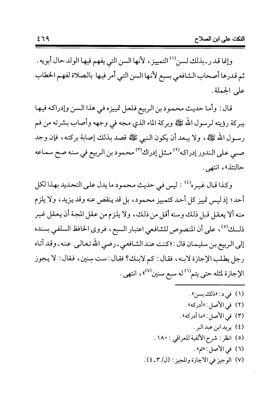 وَكَذَا قَالَ غَيره (4) لَيْسَ فِي حَدِيث مَحْمُود مَا يدل على التَّحْدِيد بِهَذَا لكل أحد إِذْ لَيْسَ تَمْيِيز كل أحد كتمييز مَحْمُود بل قد ينقص عَنهُ وَقد يزِيد وَلَا يلْزم مِنْهُ أَلا يعقل قبل ذَلِك وسنه أقل من ذَلِك وَلَا يلْزم من عقل المجة أَن يعقل غير ذَلِك (5) على أَن الْمَنْصُوص للشَّافِعِيّ اعْتِبَار السَّبع فروى الْحَافِظ السلَفِي بِسَنَدِهِ إِلَى الرّبيع بن سُلَيْمَان قَالَ كنت عِنْد الشَّافِعِي - رَضِي الله تَعَالَى عَنهُ - وَقد أَتَاهُ رجل يطْلب الْإِجَازَة لِابْنِهِ فَقَالَ كم لابنك فَقَالَ سِتّ سِنِين فَقَالَ لَا يجوز الْإِجَازَة لمثله حَتَّى يتم (6) لَهُ سبع سِنِين (7) انْتهى