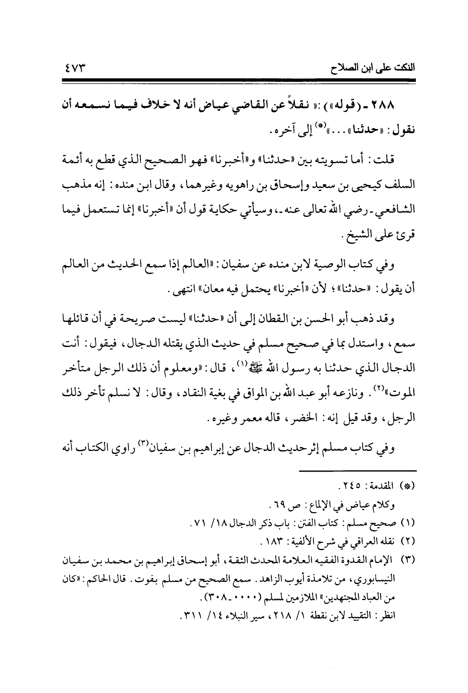 288 - (قَوْله) نقلا عَن القَاضِي عِيَاض أَنه لَا خلاف فِيمَا نَسْمَعهُ أَن نقُول حَدثنَا (3 4 5 6 7 8 9 10 11 12 رَاوِي الْكتاب أَنه