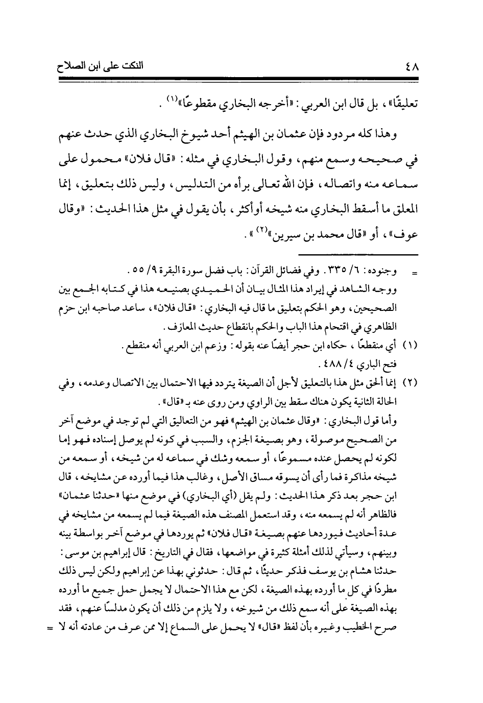 وَهَذَا كُله مَرْدُود فَإِن عُثْمَان بن الْهَيْثَم أحد شُيُوخ البُخَارِيّ الَّذِي حدث عَنْهُم فِي صَحِيحه وَسمع مِنْهُم وَقَول البُخَارِيّ فِي مثله قَالَ فلَان مَحْمُول على سَمَاعه مِنْهُ واتصاله فَإِن الله تَعَالَى برأه من التَّدْلِيس وَلَيْسَ ذَلِك بتعليق إِنَّمَا الْمُعَلق مَا أسقط البُخَارِيّ مِنْهُ شَيْخه أَو أَكثر بِأَن يَقُول فِي مثل هَذَا الحَدِيث وَقَالَ عَوْف أَو قَالَ مُحَمَّد بن سِيرِين
