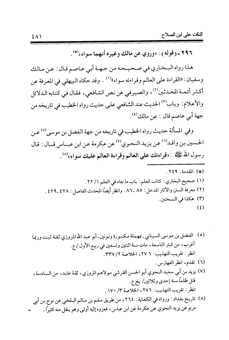 296 - (قَوْله) وَرُوِيَ عَن مَالك وَغَيره أَنَّهُمَا سَوَاء (2 3 4 5 6 7 قَالَ رَسُول الله صلى الله عَلَيْهِ وَسلم قراءتك على الْعَالم وَقِرَاءَة الْعَالم عَلَيْك سَوَاء (8)