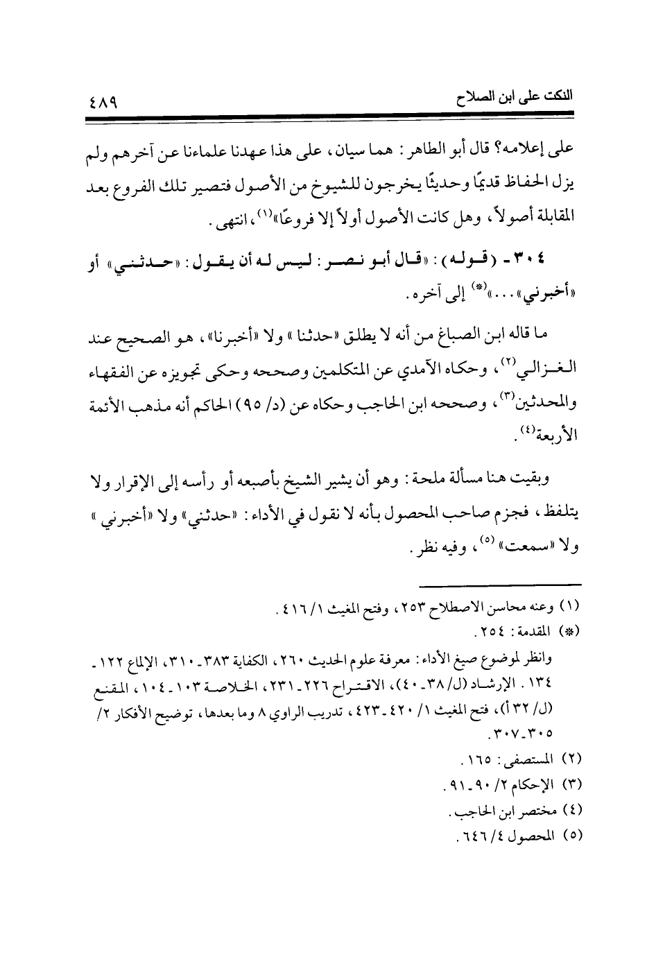 304 - (قَوْله) قَالَ أَبُو نصر لَيْسَ لَهُ أَن يَقُول حَدثنِي أَو أَخْبرنِي (5 6 7 8 9 نقُول فِي الْأَدَاء حَدثنِي وَلَا أَخْبرنِي وَلَا سَمِعت (5) وَفِيه نظر