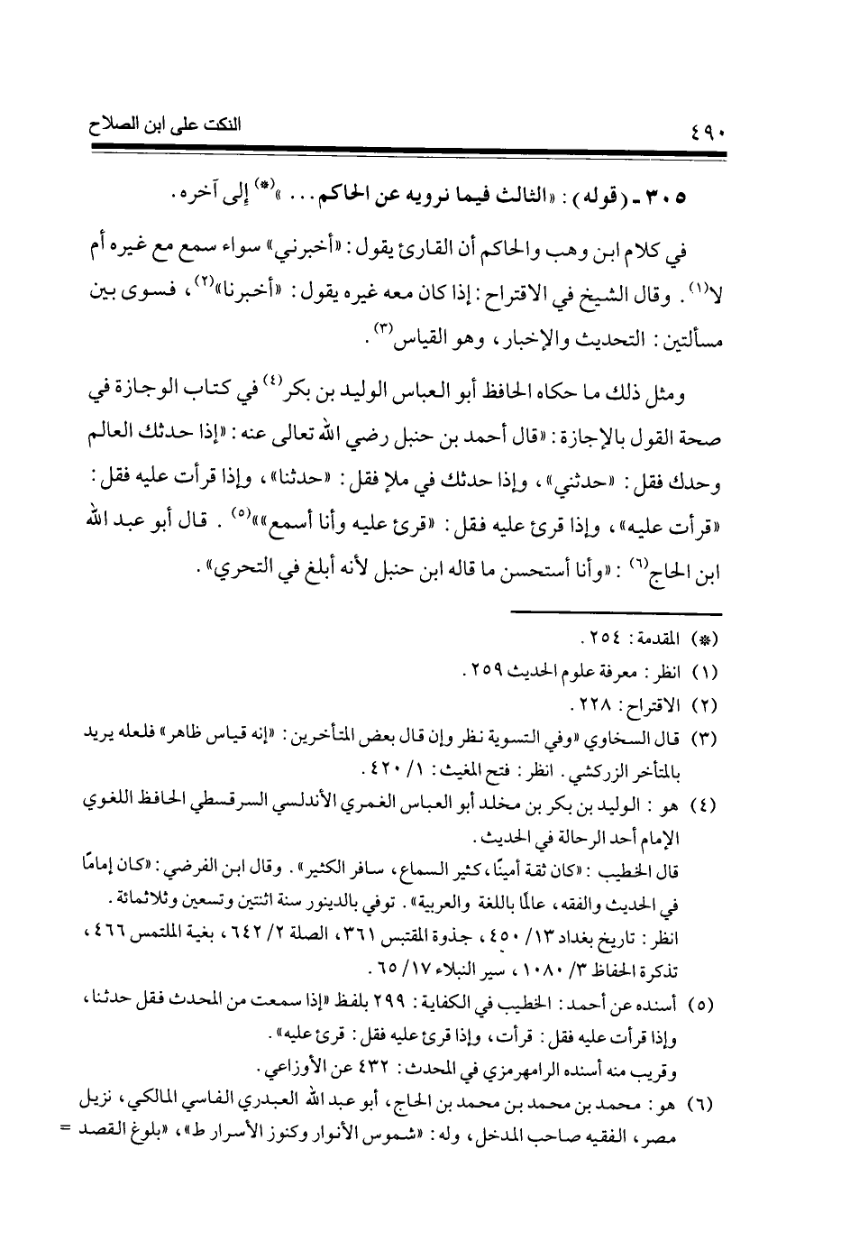 وَمثل ذَلِك مَا حَكَاهُ الْحَافِظ أَبُو الْعَبَّاس الْوَلِيد بن بكر (4) فِي كتاب الوجازة فِي صِحَة القَوْل بِالْإِجَازَةِ قَالَ أَحْمد بن حَنْبَل رَضِي الله تَعَالَى عَنهُ إِذا حَدثَك الْعَالم وَحدك فَقل حَدثنِي وَإِذا حَدثَك فِي ملإ فَقل حَدثنَا وَإِذا قَرَأت عَلَيْهِ فَقل قَرَأت عَلَيْهِ وَإِذا قرئَ عَلَيْهِ فَقل قرئَ عَلَيْهِ وَأَنا أسمع (5) قَالَ أَبُو عبد الله ابْن الْحَاج (6) وَأَنا اسْتحْسنَ مَا قَالَه ابْن حَنْبَل لِأَنَّهُ أبلغ فِي التَّحَرِّي