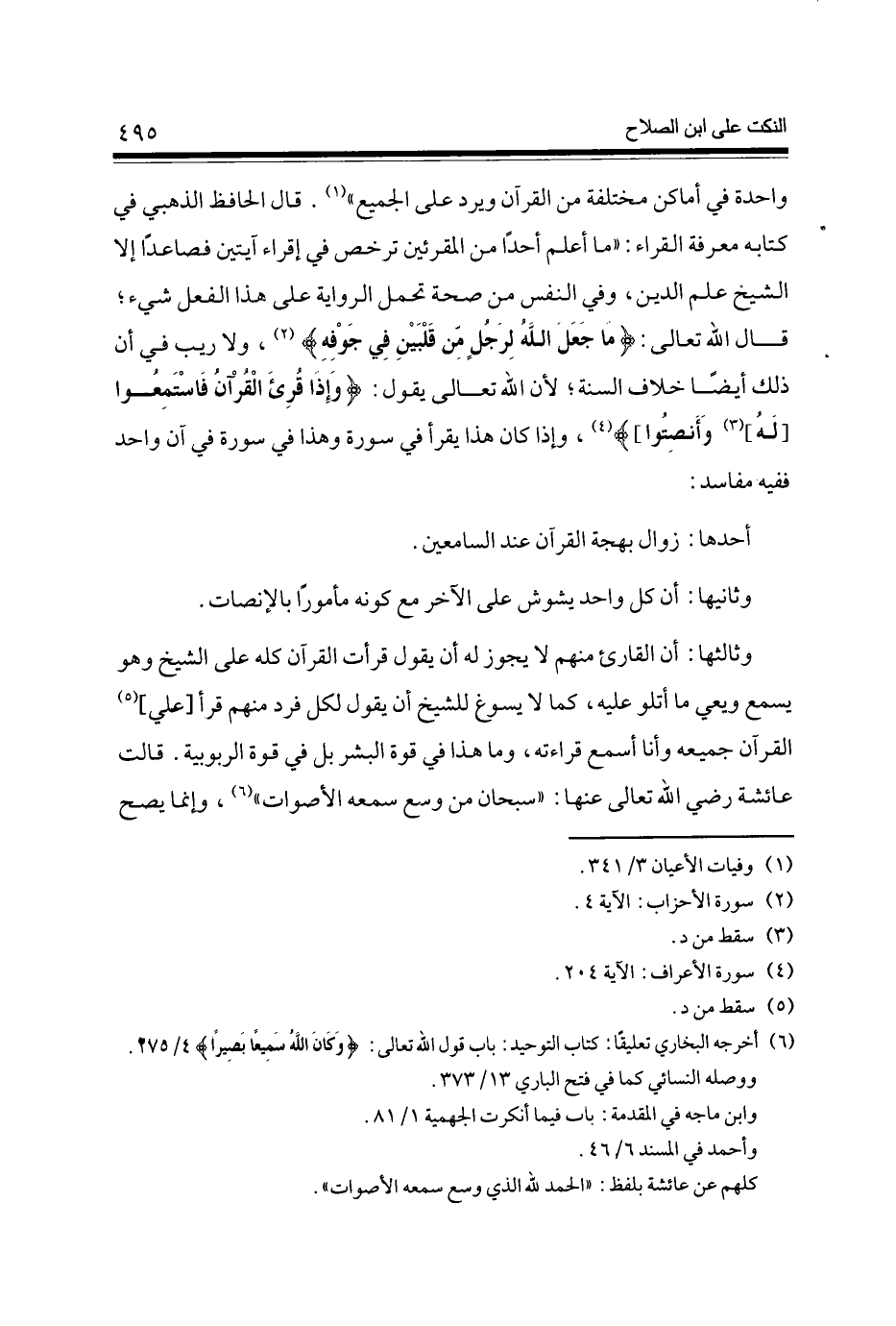 وَاحِدَة فِي أَمَاكِن مُخْتَلفَة من الْقُرْآن وَيرد على الْجَمِيع (1) قَالَ الْحَافِظ الذَّهَبِيّ فِي كِتَابه معرفَة الْقُرَّاء مَا أعلم أحدا من المقرئين ترخص فِي إقراء آيَتَيْنِ فَصَاعِدا إِلَّا الشَّيْخ علم الدّين وَفِي النَّفس من صِحَة تحمل الرِّوَايَة على هَذَا الْفِعْل شَيْء قَالَ الله تَعَالَى {مَا جعل الله لرجل من قلبين فِي جَوْفه} وَلَا ريب فِي أَن ذَلِك ايضا خلاف السّنة لِأَن الله تَعَالَى يقو ل {وَإِذا قرئَ الْقُرْآن} فَاسْتَمعُوا [لَهُ] (3) وأنصتوا] ) (4) وَإِذا كَانَ هَذَا يقْرَأ فِي سُورَة وَهَذَا فِي سُورَة فِي آن وَاحِد فَفِيهِ مفاسد