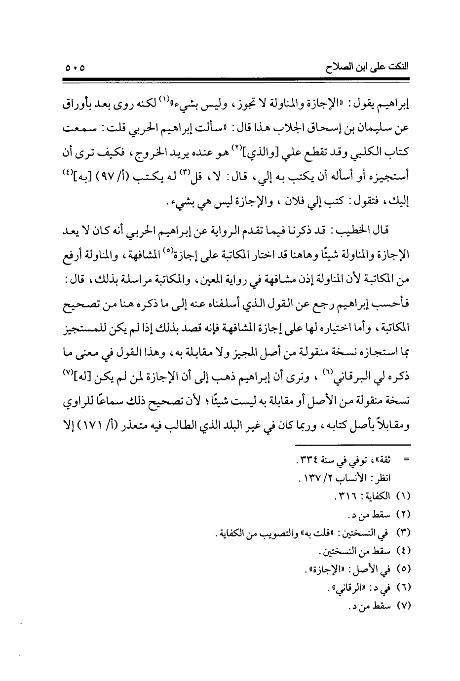 قَالَ الْخَطِيب قد ذكرنَا فِيمَا تقدم الرِّوَايَة عَن إِبْرَاهِيم الْحَرْبِيّ أَنه كَانَ لَا يعد الْإِجَازَة والمناولة شَيْئا وَهَا هُنَا قد اخْتَار الْمُكَاتبَة على إجَازَة (5) المشافهة والمناولة أرفع من الْمُكَاتبَة لِأَن المناولة إِذن مشافهة فِي رِوَايَة الْمعِين وَالْمُكَاتبَة مراسلة بذلك قَالَ فأحسب إِبْرَاهِيم رَجَعَ عَن القَوْل الَّذِي أسلفناه عَنهُ إِلَى مَا ذكره هُنَا من تَصْحِيح الْمُكَاتبَة وَأما اخْتِيَاره لَهَا على إجَازَة المشافهة فَإِنَّهُ قصد بذلك إِذا لم يكن للمستجيز بِمَا استجازه نُسْخَة منقولة من أصل الْمُجِيز وَلَا مُقَابلَة بِهِ وَهَذَا القَوْل فِي معنى مَا ذكره لي البرقاني (6) ونرى أَن إِبْرَاهِيم ذهب إِلَى أَن الْإِجَازَة لمن لم يكن [لَهُ] (7) نُسْخَة منقولة من الأَصْل أَو مُقَابلَة بِهِ لَيست شَيْئا لِأَن تَصْحِيح ذَلِك سَمَاعا للراوي ومقابلا بِأَصْل كِتَابه وَرُبمَا كَانَ فِي غير الْبَلَد الَّذِي الطَّالِب فِيهِ مُتَعَذر (أ / 171) إِلَّا
