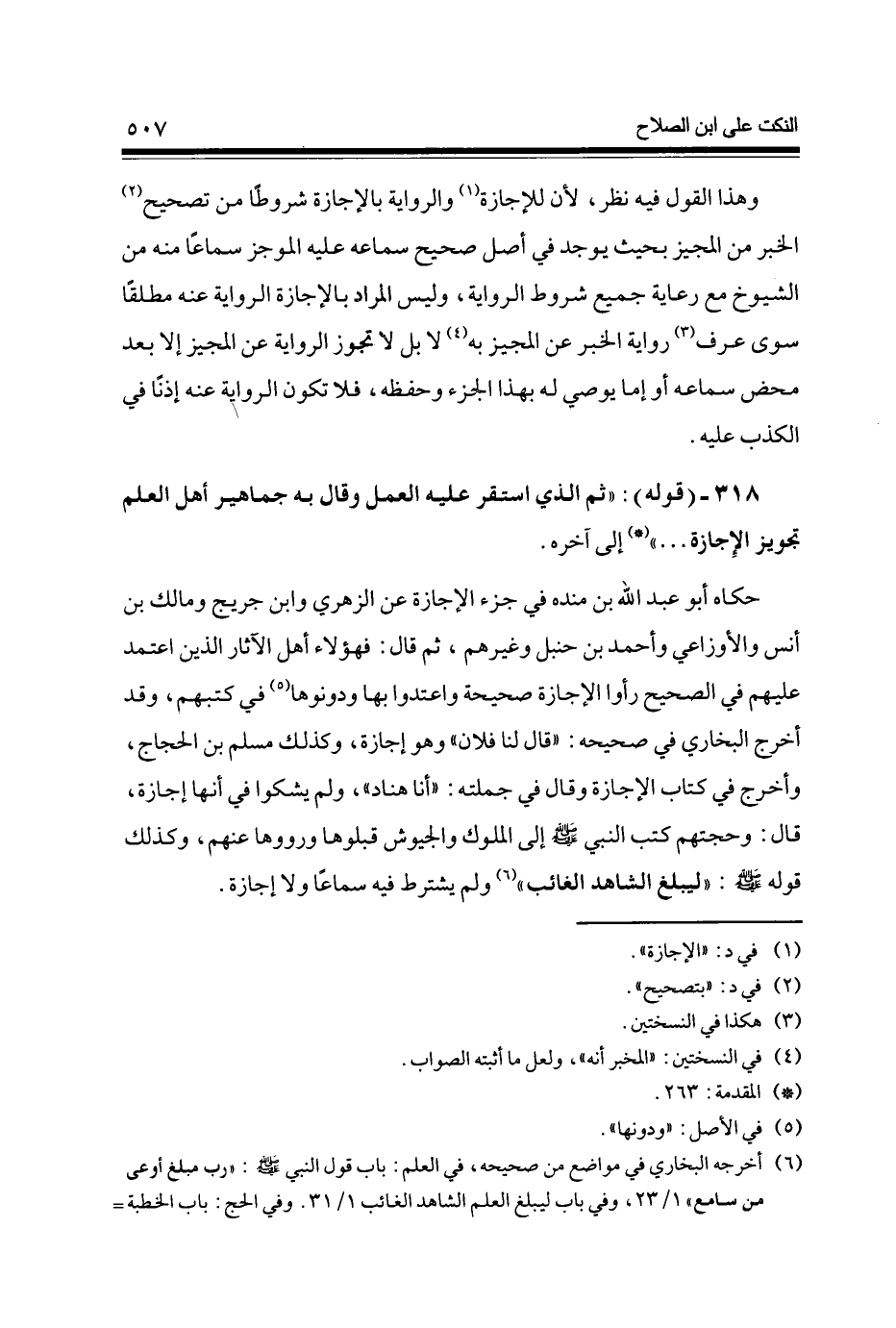 318 - (قَوْله) ثمَّ الَّذِي اسْتَقر عَلَيْهِ الْعَمَل وَقَالَ بِهِ جَمَاهِير أهل الْعلم تَجْوِيز الْإِجَازَة (7 8 9 10 11 12 13 الْغَائِب (6) وَلم يشْتَرط فِيهِ سَمَاعا وَلَا إجَازَة