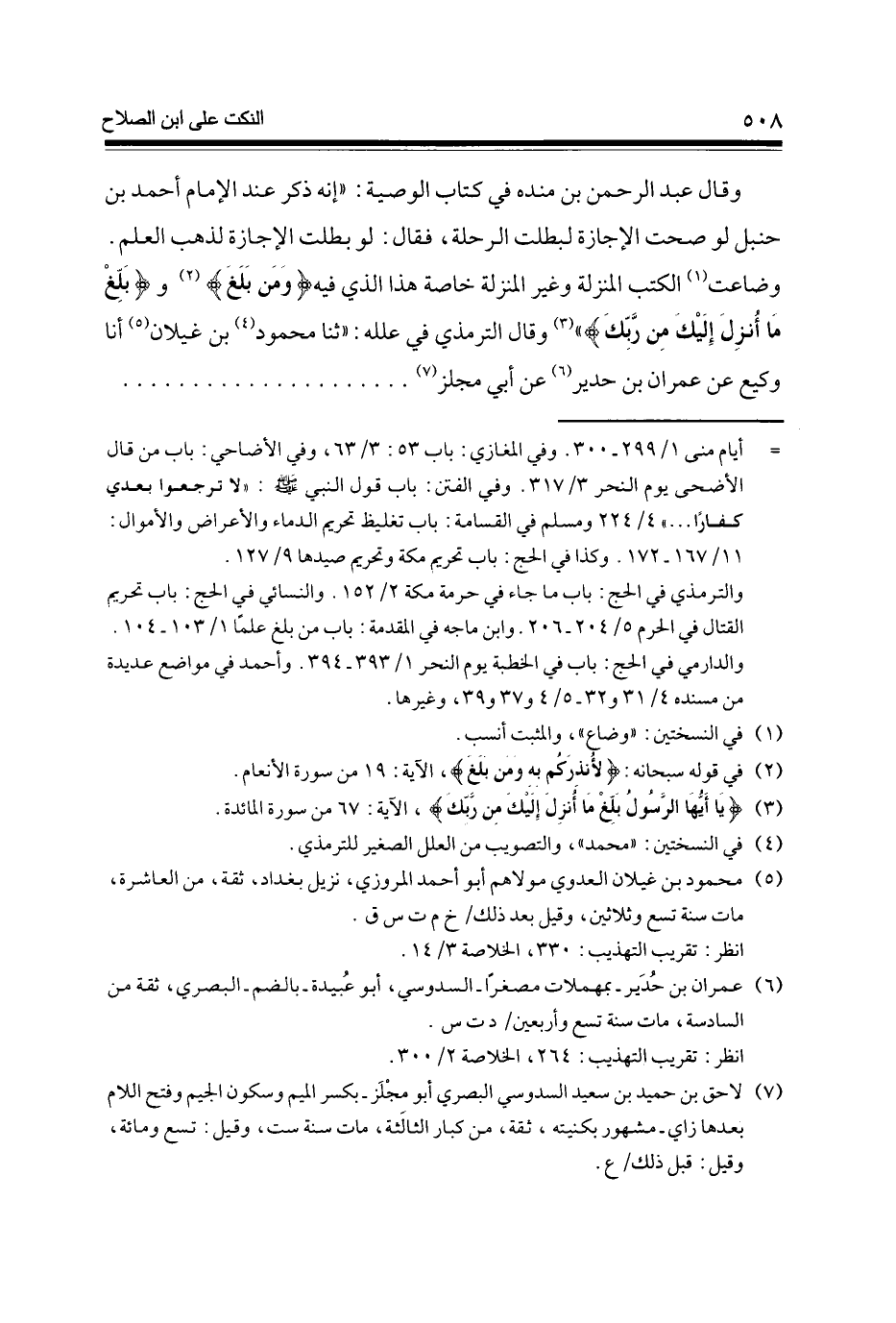 وَقَالَ عبد الرَّحْمَن بن مَنْدَه فِي كتاب الْوَصِيَّة إِنَّه ذكر عِنْد الإِمَام أَحْمد بن حَنْبَل لَو صحت الْإِجَازَة لبطلت الرحلة فَقَالَ لَو بطلت الْإِجَازَة لذهب الْعلم وضاعت (1) الْكتب الْمنزلَة وَغير الْمنزلَة خَاصَّة هَذَا الَّذِي فِيهِ {وَمن بلغ} (2) و {بلغ مَا أنزل إِلَيْك من رَبك} وَقَالَ التِّرْمِذِيّ فِي علله ثَنَا مَحْمُود (4) بن غيلَان (5) أَنا وَكِيع عَن عمرَان بن حدير (6) عَن أبي مجلز (7)