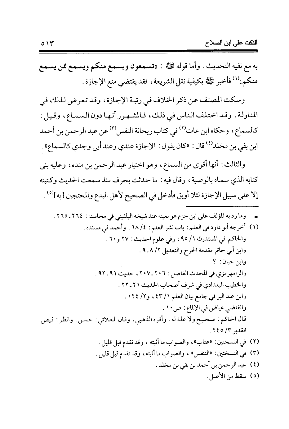 وَسكت المُصَنّف عَن ذكر الْخلاف فِي رُتْبَة الْإِجَازَة وَقد تعرض لذَلِك فِي المناولة وَقد اخْتلف النَّاس فِي ذَلِك فَالْمَشْهُور أَنَّهَا دون السماع وَقيل كالسماع وَحَكَاهُ ابْن عَاتٍ (2) فِي كتاب رَيْحَانَة النَّفس (3) عَن عبد الرَّحْمَن بن أَحْمد ابْن بَقِي بن مخلد (4) قَالَ كَانَ يَقُول الْإِجَازَة عِنْدِي وَعند ابي وجدي كالسماع