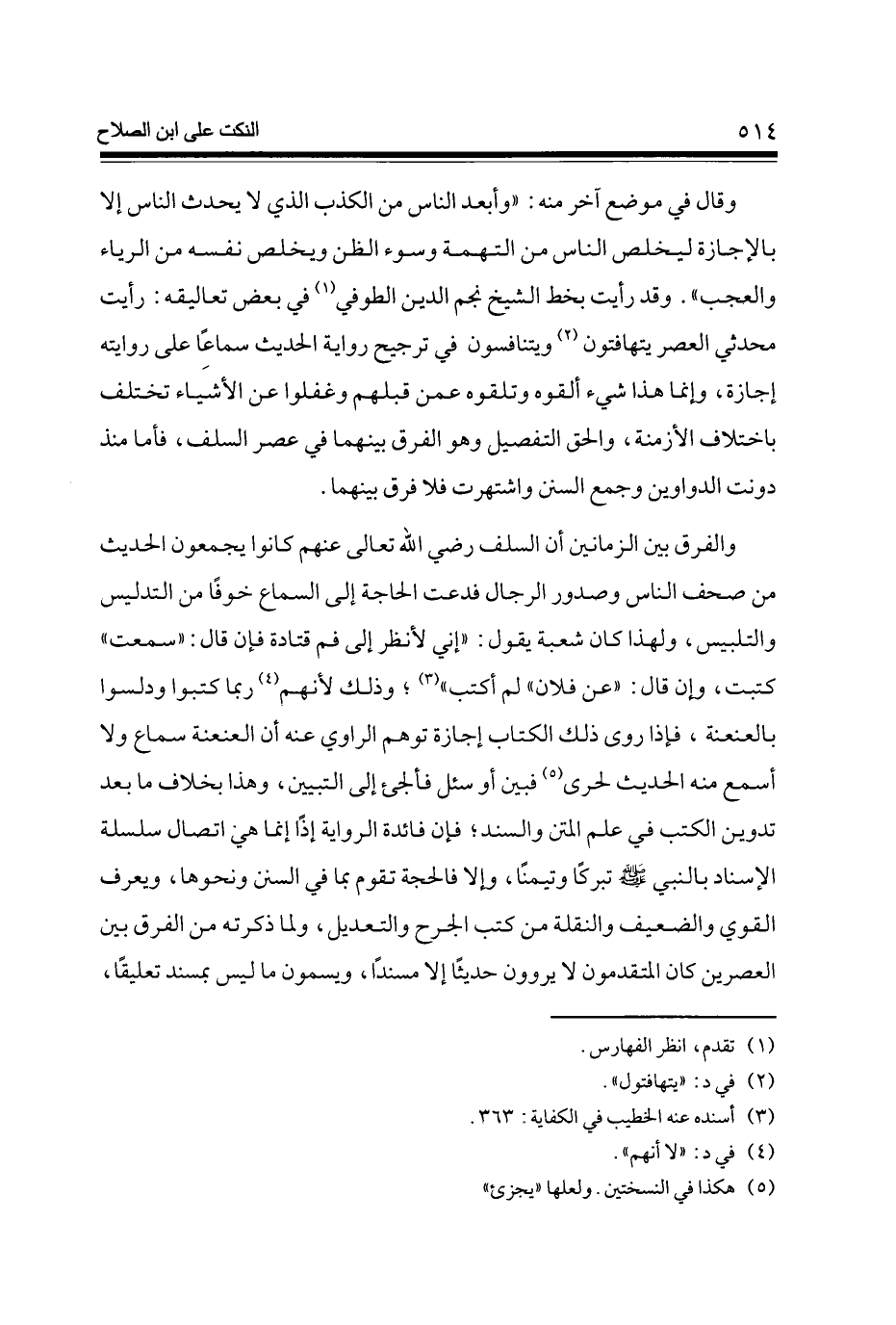 وَقَالَ فِي مَوضِع آخر مِنْهُ وَأبْعد النَّاس من الْكَذِب الَّذِي لَا يحدث النَّاس إِلَّا بِالْإِجَازَةِ ليخلص النَّاس من التُّهْمَة وَسُوء الظَّن ويخلص نَفسه من الرِّيَاء وَالْعجب وَقد رَأَيْت بِخَط الشَّيْخ نجم الدّين الطوفي (1) فِي بعض تعاليقه رَأَيْت محدثي الْعَصْر يتهافتون (2) ويتنافسون فِي تَرْجِيح رِوَايَة الحَدِيث سَمَاعا على رِوَايَته إجَازَة وَإِنَّمَا هَذَا شَيْء ألقوه وتلقوه عَمَّن قبلهم وغفلوا عَن الْأَشْيَاء تخْتَلف باخْتلَاف الْأَزْمِنَة وَالْحق التَّفْصِيل وَهُوَ الْفرق بَينهمَا فِي عصر السّلف فَأَما مُنْذُ دونت الدَّوَاوِين وَجمع السّنَن واشتهرت فَلَا فرق بَينهمَا