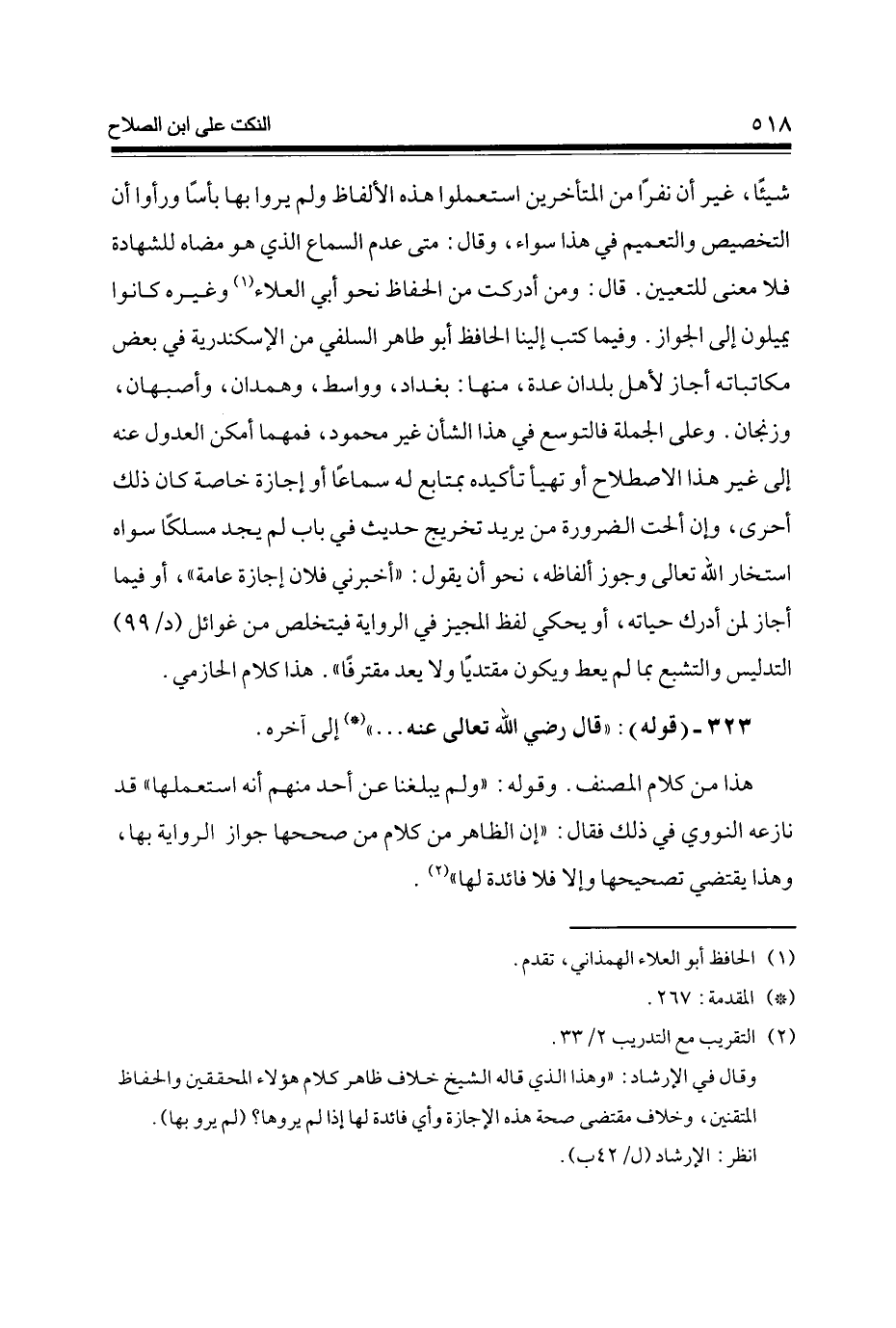 شَيْئا غير أَن نَفرا من الْمُتَأَخِّرين استعملوا هَذِه الْأَلْفَاظ وَلم يرَوا بهَا باسا وَرَأَوا أَن التَّخْصِيص والتعميم فِي هَذَا سَوَاء وَقَالَ مَتى عدم السماع الَّذِي هُوَ مضاه للشَّهَادَة فَلَا معنى للتعيين قَالَ وَمن أدْركْت من الْحفاظ نَحْو أبي الْعَلَاء (1) وَغَيره كَانُوا يميملون إِلَى الْجَوَاز وَفِيمَا كتب إِلَيْنَا الْحَافِظ أَبُو طَاهِر السلَفِي من الْإسْكَنْدَريَّة فِي بعض مكاتباته أجَاز لأهل بلدان عدَّة مِنْهَا بَغْدَاد وواسط وهمدان وأصبهان وزنجان وعَلى الْجُمْلَة فالتوسع فِي هَذَا الشَّأْن غير مَحْمُود فمهما أمكن الْعُدُول عَنهُ إِلَى غير هَذَا الِاصْطِلَاح أَو تهَيَّأ تأكيده بمتابع لَهُ سَمَاعا أَو إجَازَة خَاصَّة كَانَ ذَلِك أَحْرَى وَإِن ألحت الضَّرُورَة من يُرِيد تَخْرِيج حَدِيث فِي بَاب لم يجد مسلكا سواهُ استخار الله تَعَالَى وَجوز أَلْفَاظه نَحْو أَن يَقُول أَخْبرنِي فلَان إجَازَة عَامَّة أَو فِيمَا أجَاز لمن أدْرك حَيَاته أَو يَحْكِي لفظ الْمُجِيز فِي الرِّوَايَة فيتخلص من غوائل (د / 99) التَّدْلِيس والتشبع بِمَا لم يُعْط وَيكون مقتديا وَلَا يعد مقترفا هَذَا كَلَام الْحَازِمِي