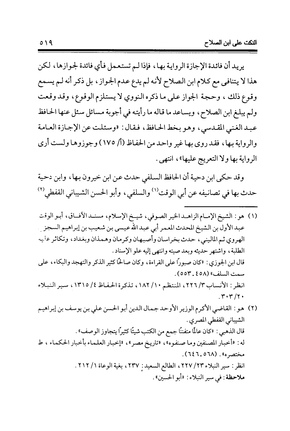 يُرِيد أَن فَائِدَة الْإِجَازَة الرِّوَايَة بهَا فَإِذا لم تسْتَعْمل فَأَي فَائِدَة لجوازها لَكِن هَذَا لَا يتنافى مَعَ كَلَام ابْن الصّلاح لِأَنَّهُ لم يدع عدم الْجَوَاز بل ذكر أَنه لم يسمع وُقُوع ذَلِك وَحجَّة الْجَوَاز على مَا ذكره النَّوَوِيّ لَا يسْتَلْزم الْوُقُوع وَقد وَقعت وَلم يبلغ ابْن الصّلاح ويساعد مَا قَالَه مَا رَأَيْته فِي أجوبة مسَائِل سُئِلَ عَنْهَا الْحَافِظ عبد الْغَنِيّ الْمَقْدِسِي وَهُوَ بِخَط الْحَافِظ فَقَالَ وسئلت عَن الْإِجَازَة الْعَامَّة وَالرِّوَايَة بهَا فقد روى بهَا غير وَاحِد من الْحفاظ (أ / 175) وجوزوها وَلست أرى الرِّوَايَة بهَا وَلَا التعريج عَلَيْهَا انْتهى
