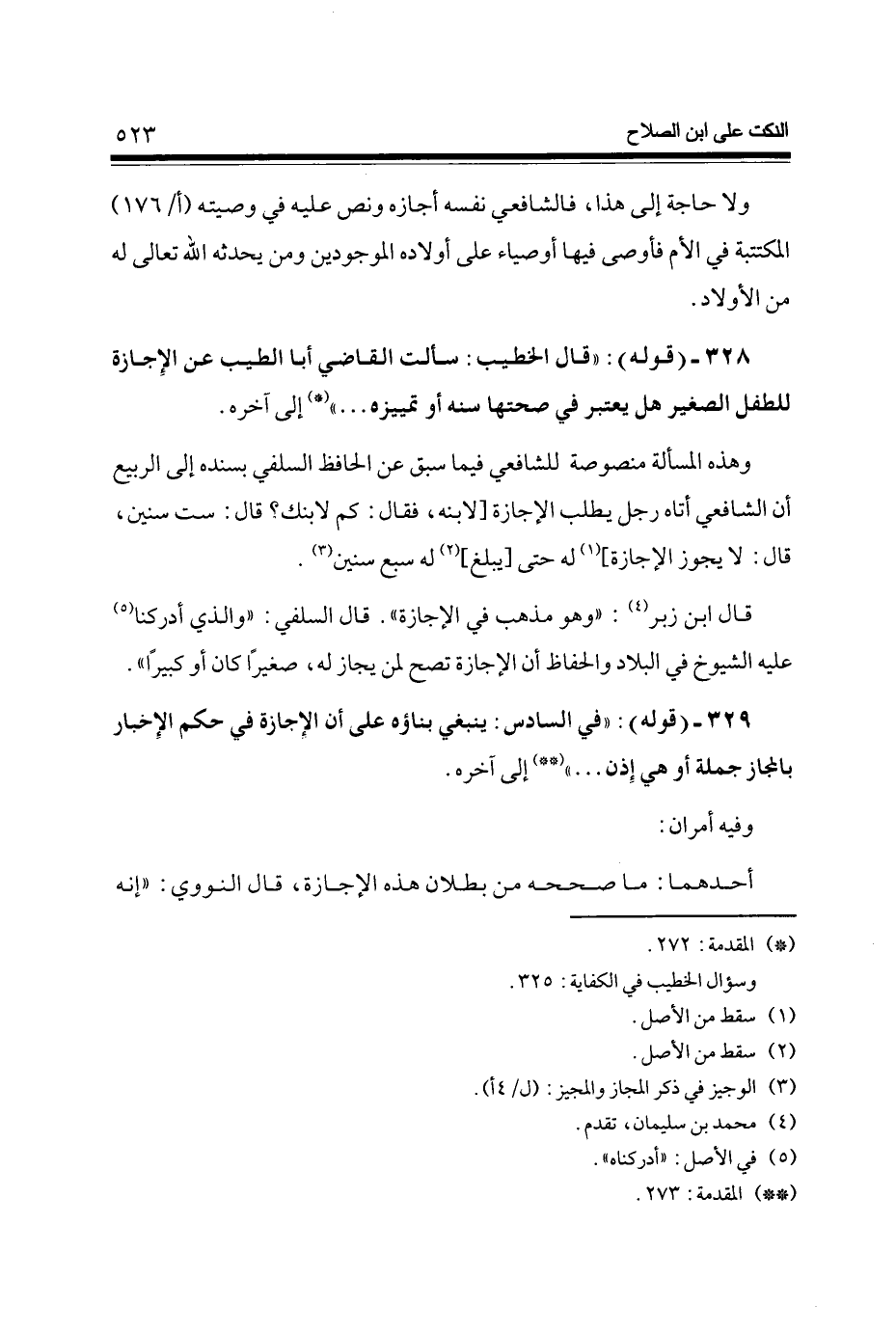 قَالَ ابْن زبر (4) وَهُوَ مَذْهَب فِي الْإِجَازَة قَالَ السلَفِي وَالَّذِي أدركنا (5) عَلَيْهِ الشُّيُوخ فِي الْبِلَاد والحفاظ أَن الْإِجَازَة تصح لمن يجاز لَهُ صَغِيرا كَانَ أَو كَبِيرا