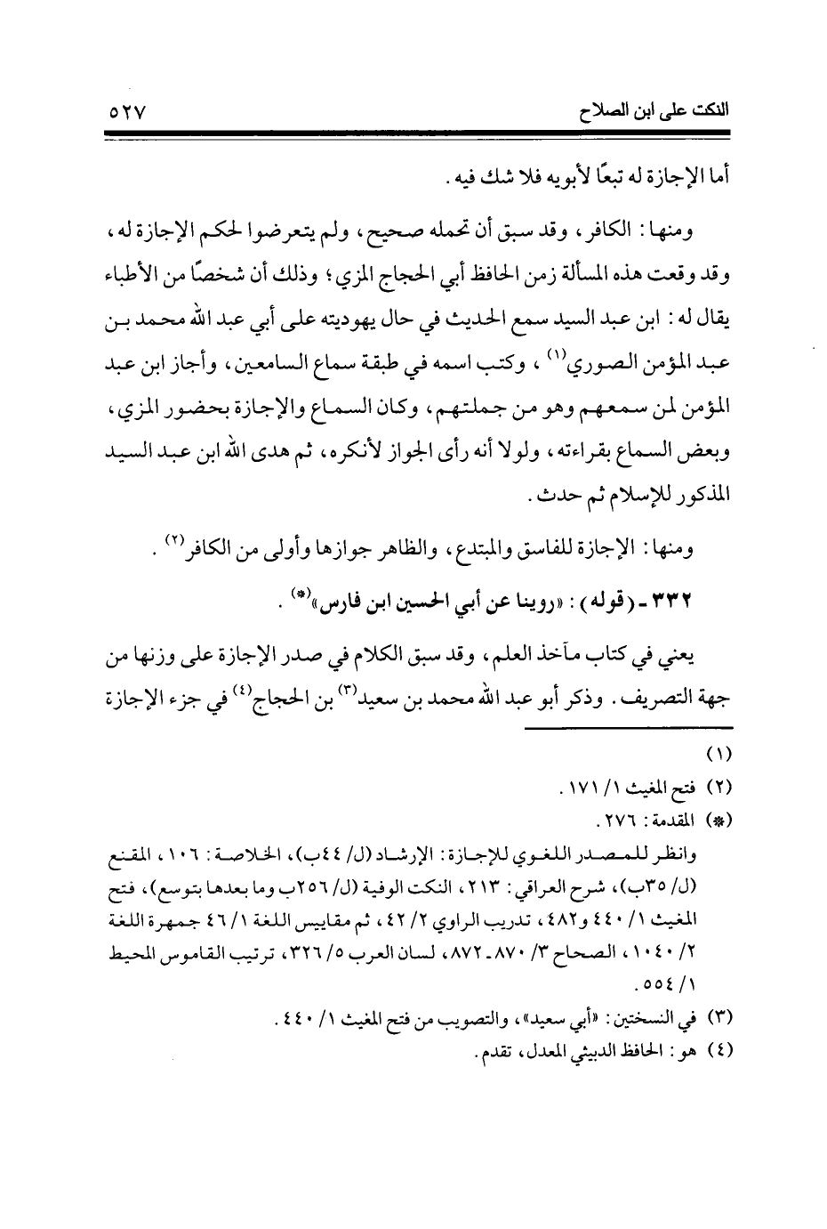 332 - (قَوْله) روينَا عَن أبي الْحُسَيْن ابْن فَارس (9 10 عبد الله مُحَمَّد بن سعيد (3) بن الْحجَّاج (4) فِي جُزْء الْإِجَازَة