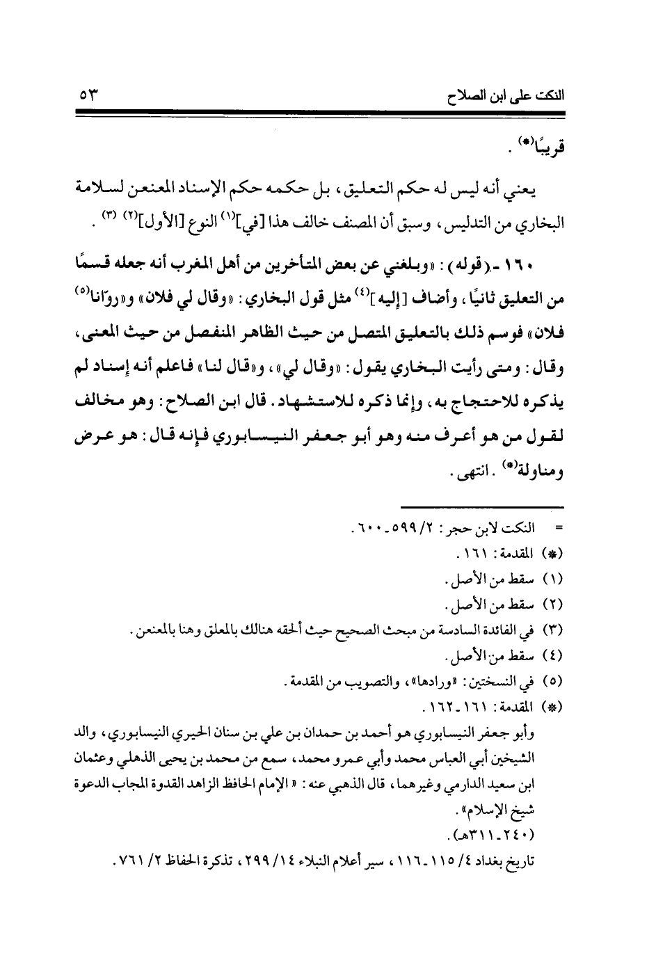 160 - (قَوْله) وَبَلغنِي عَن بعض الْمُتَأَخِّرين من أهل الْمغرب أَنه جعله قسما من التَّعْلِيق ثَانِيًا وأضاف [إِلَيْهِ] مثل قَول البُخَارِيّ وَقَالَ لي فلَان وروانا فلَان فوسم ذَلِك بِالتَّعْلِيقِ الْمُتَّصِل من حَيْثُ الظَّاهِر الْمُنْفَصِل من حَيْثُ الْمَعْنى وَقَالَ وَمَتى رَأَيْت البُخَارِيّ يَقُول وَقَالَ لي وَقَالَ لنا فَاعْلَم أَنه إِسْنَاد لم يذكرهُ للاحتجاج بِهِ وَإِنَّمَا ذكره للاستشهاد قَالَ ابْن الصّلاح وَهُوَ مُخَالف لقَوْل من هُوَ أعرف مِنْهُ وَهُوَ أَبُو جَعْفَر النَّيْسَابُورِي فَإِنَّهُ قَالَ هُوَ عرض ومناولة انْتهى