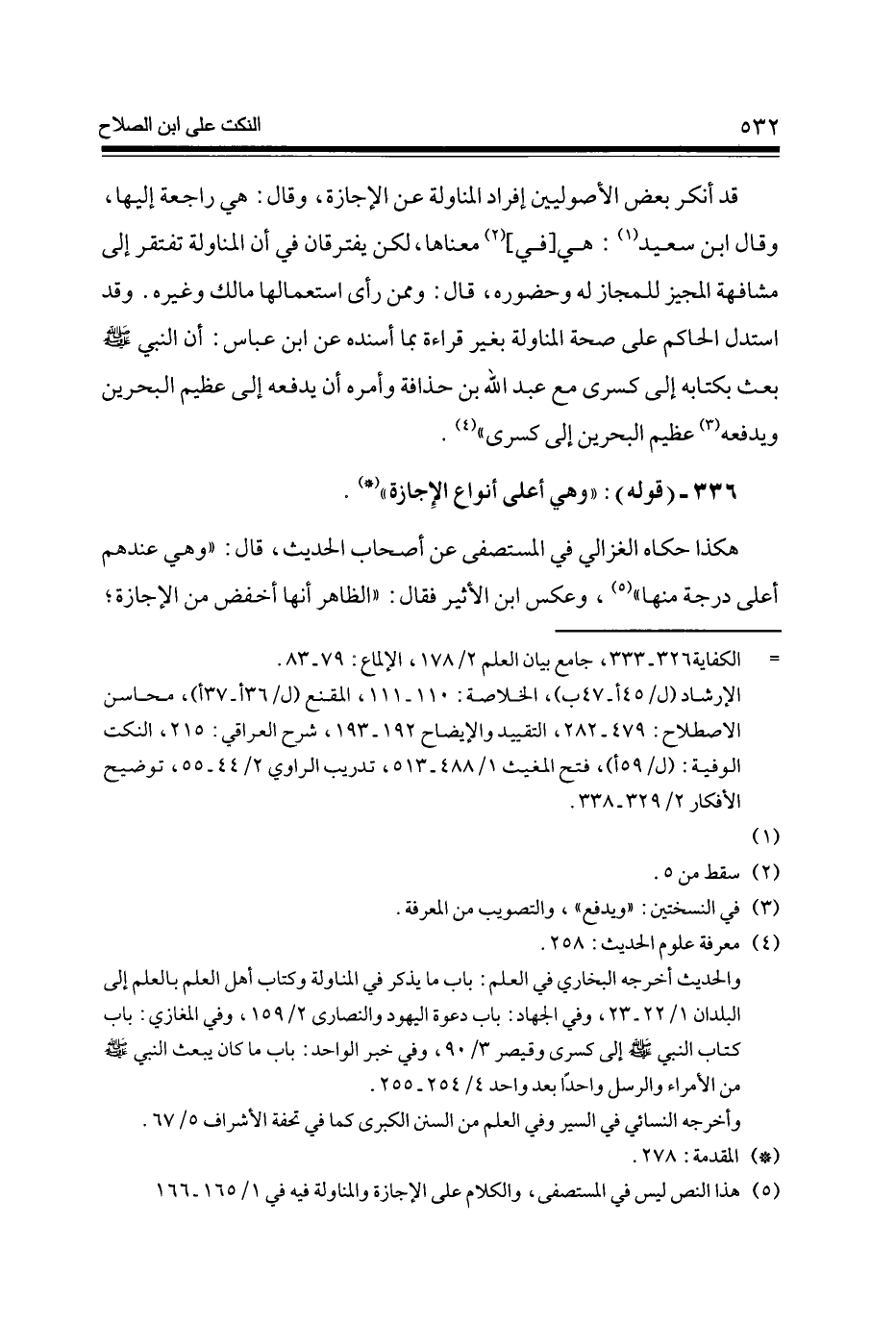 قد أنكر بعض الْأُصُولِيِّينَ إِفْرَاد المناولة عَن الْإِجَازَة وَقَالَ هِيَ رَاجِعَة إِلَيْهَا وَقَالَ ابْن سعيد (1) هِيَ [فِي] (2) مَعْنَاهَا لَكِن يفترقان فِي أَن المناولة تفْتَقر إِلَى مشافهة الْمُجِيز للمجاز لَهُ وحضوره قَالَ وَمِمَّنْ رأى اسْتِعْمَالهَا مَالك وَغَيره وَقد اسْتدلَّ الْحَاكِم على صِحَة المناولة بِغَيْر قِرَاءَة بِمَا أسْندهُ عَن ابْن عَبَّاس أَن النَّبِي صلى الله عَلَيْهِ وَسلم بعث بكتابه إِلَى كسْرَى مَعَ عبد الله بن حذافة وَأمره أَن يَدْفَعهُ (3) إِلَى عَظِيم الْبَحْرين ويدفعه عَظِيم الْبَحْرين إِلَى كسْرَى (4)