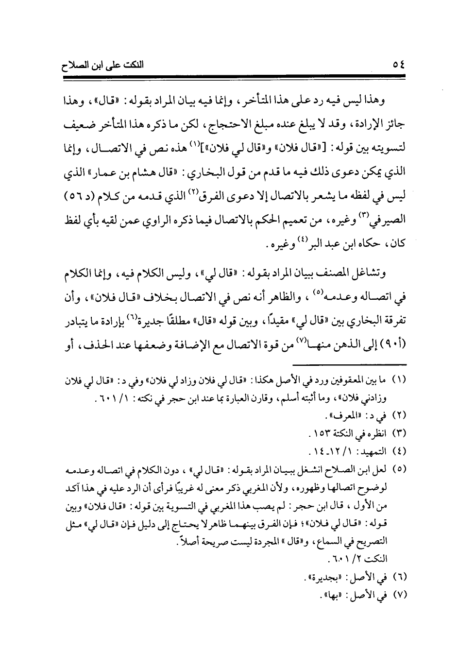 وَهَذَا لَيْسَ فِيهِ رد على هَذَا الْمُتَأَخر وَإِنَّمَا فِيهِ بَيَان المُرَاد بقوله قَالَ وَهَذَا جَائِز الْإِرَادَة وَقد لَا يبلغ عِنْده مبلغ الِاحْتِجَاج لَكِن مَا ذكره هَذَا الْمُتَأَخر ضَعِيف لتسويته بَين قَوْله [قَالَ فلَان وَقَالَ لي فلَان] هَذِه نَص فِي الِاتِّصَال وَإِنَّمَا الَّذِي يُمكن دَعْوَى ذَلِك فِيهِ مَا قدم من قَول البُخَارِيّ قَالَ هِشَام بن عمار الَّذِي لَيْسَ فِي لَفظه مَا يشْعر بالاتصال إِلَّا دَعْوَى الْفرق الَّذِي قدمه من كَلَام (د 56) الصَّيْرَفِي وَغَيره من تَعْمِيم الحكم بالاتصال فِيمَا ذكره الرَّاوِي عَمَّن لقِيه بِأَيّ لفظ كَانَ حَكَاهُ ابْن عبد الْبر وَغَيره