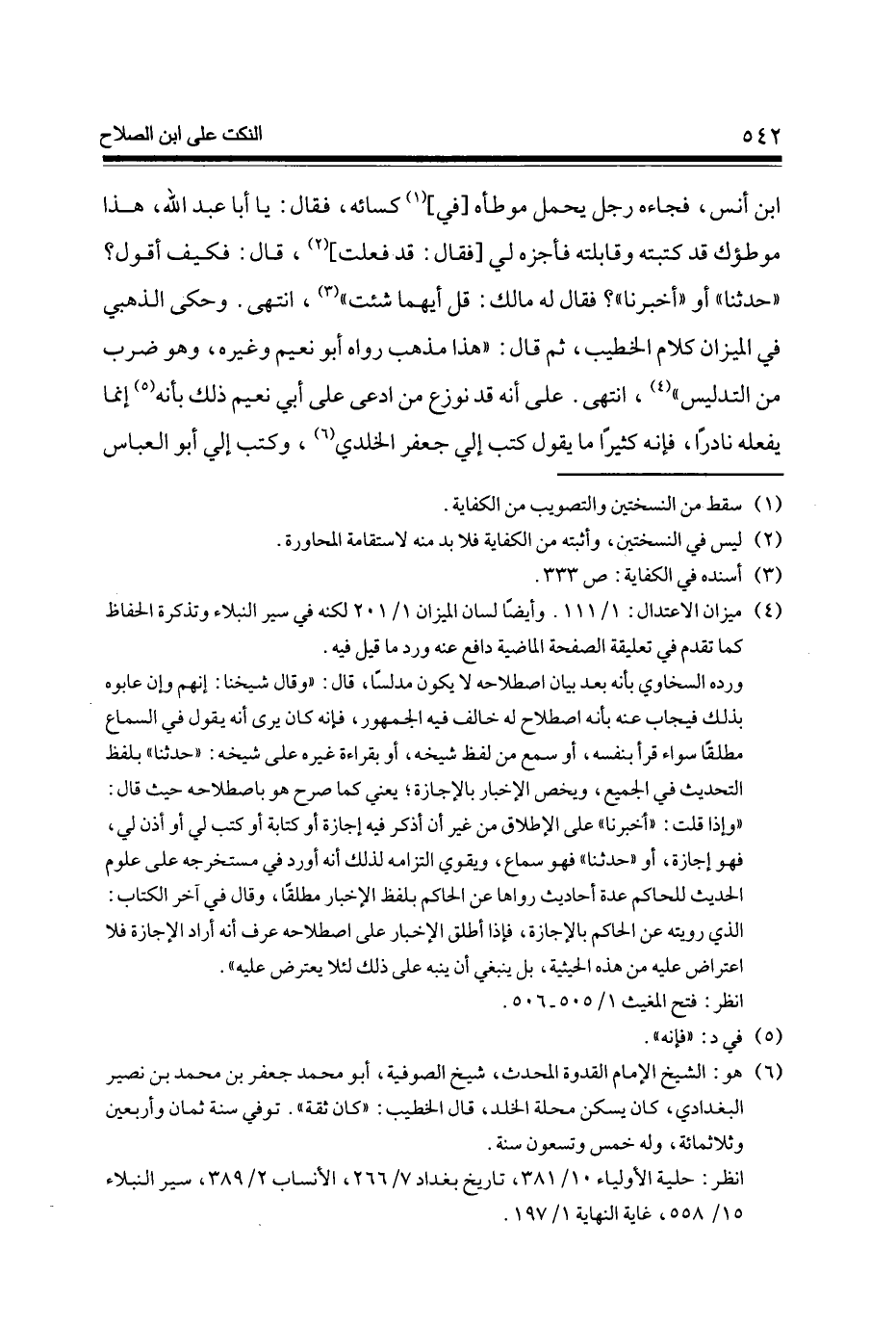 ابْن أنس فَجَاءَهُ رجل يحمل موطأه [فِي] (1) كسائه فَقَالَ يَا أَبَا عبد الله هَذَا موطؤك قد كتبته وقابلته فأجزه لي [فَقَالَ قد فعلت] (2) قَالَ فَكيف أَقُول حَدثنَا أَو أخبرنَا فَقَالَ لَهُ مَالك قل أَيهمَا شِئْت (3) انْتهى وَحكى الذَّهَبِيّ فِي الْمِيزَان كَلَام الْخَطِيب ثمَّ قَالَ هَذَا مَذْهَب رَوَاهُ أَبُو نعيم وَغَيره وَهُوَ ضرب من التَّدْلِيس (4) انْتهى على أَنه قد نوزع من ادّعى على أبي نعيم ذَلِك بِأَنَّهُ (5) إِنَّمَا يَفْعَله نَادرا فَإِنَّهُ كثيرا مَا يَقُول كتب إِلَيّ جَعْفَر الْخُلْدِيِّ (6) وَكتب إِلَيّ أَبُو الْعَبَّاس