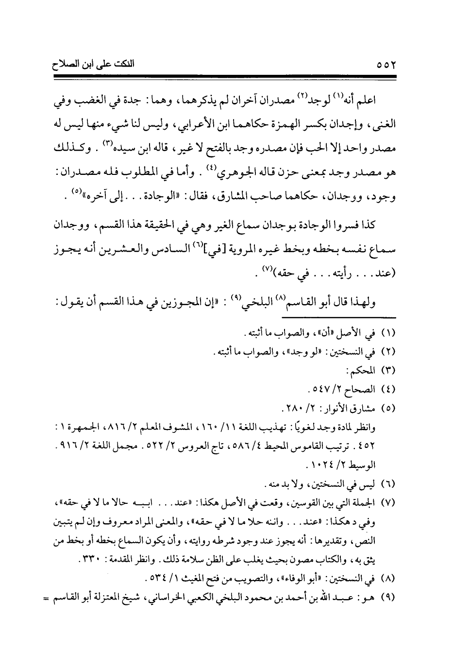 اعْلَم أَنه (1) لوجد (2) مصدران آخرَانِ لم يذكرهما وهما جدة فِي الْغَضَب وَفِي الْغنى وإجدان بِكَسْر الْهمزَة حَكَاهُمَا ابْن الْأَعرَابِي وَلَيْسَ لنا شَيْء مِنْهَا لَيْسَ لَهُ مصدر وَاحِد إِلَّا الْحبّ فَإِن مصدره وجد بِالْفَتْح لَا غير قَالَه ابْن سَيّده (3) وَكَذَلِكَ هُوَ مصدر وجد بِمَعْنى حزن قَالَه الْجَوْهَرِي (4) وَأما فِي الْمَطْلُوب فَلهُ مصدران وجود ووجدان حَكَاهُمَا صَاحب الْمَشَارِق فَقَالَ الوجادة إِلَى آخِره (5)
