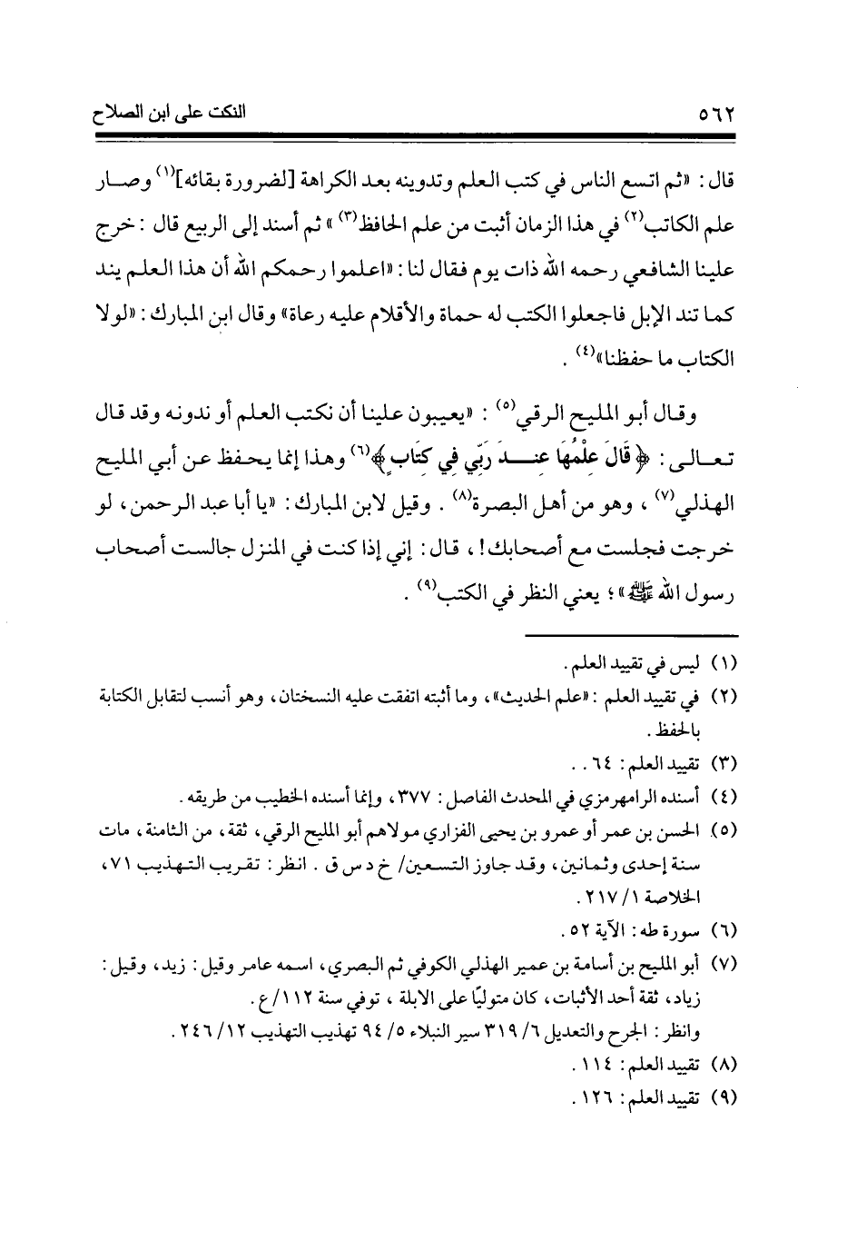 وَقَالَ أَبُو الْمليح الرقي (5) يعيبون علينا أَن نكتب الْعلم أَو ندونه وَقد قَالَ تَعَالَى {قَالَ علمهَا عِنْد رَبِّي فِي كتاب} (6) وَهَذَا إِنَّمَا يحفظ عَن أبي الْمليح الْهُذلِيّ (7) وَهُوَ من أهل الْبَصْرَة (8) وَقيل لِابْنِ الْمُبَارك يَا أَبَا عبد الرَّحْمَن لَو خرجت فَجَلَست مَعَ أَصْحَابك وَقَالَ إِنِّي إِذا كنت فِي الْمنزل جالست أَصْحَاب رَسُول الله صلى الله عَلَيْهِ وَسلم يَعْنِي النّظر فِي الْكتب (9)