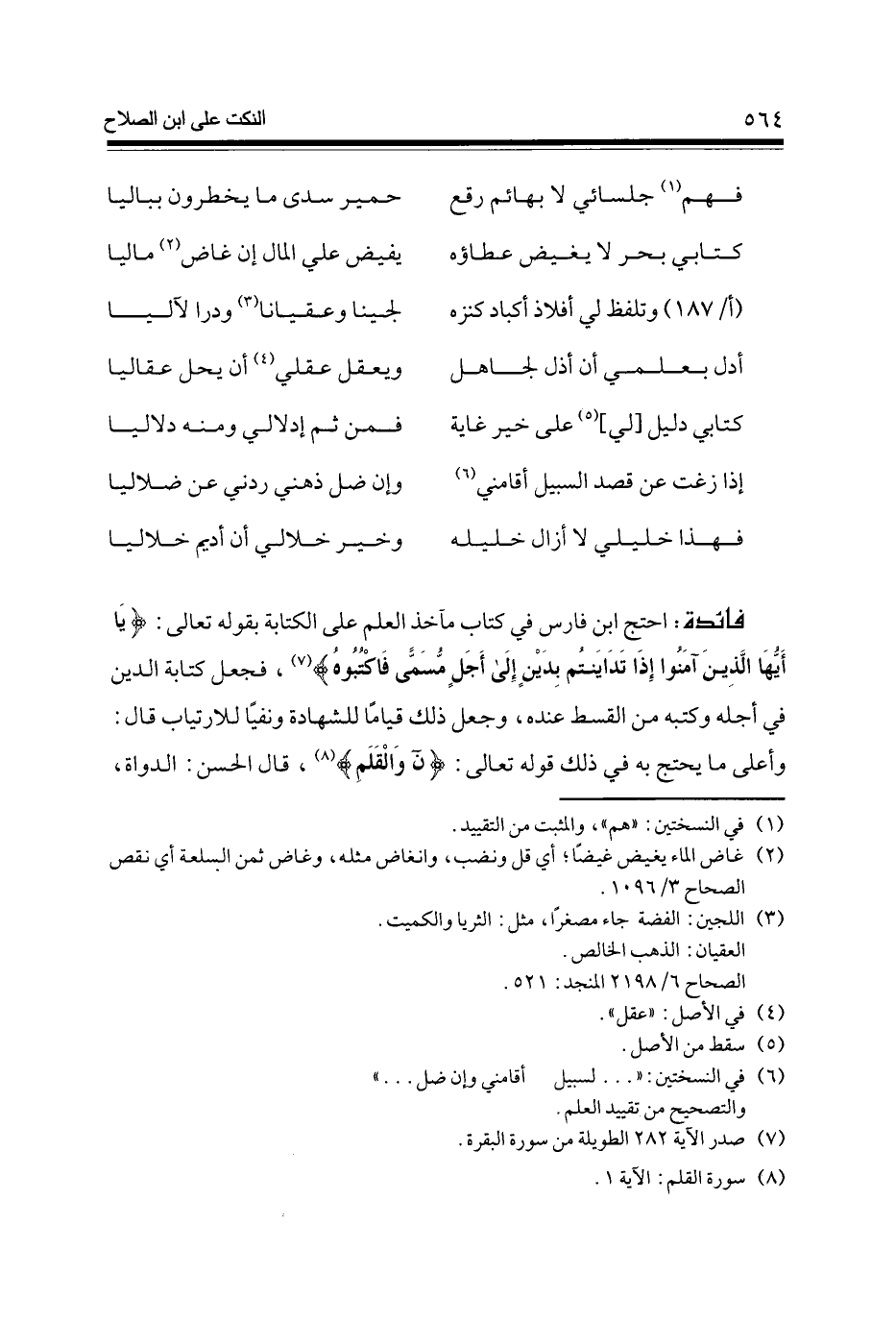 فَائِدَة احْتج ابْن فَارس فِي كتاب مآخذ الْعلم على الْكِتَابَة بقوله تَعَالَى {يَا أَيهَا الَّذين آمنُوا إِذا تداينتم بدين إِلَى أجل مُسَمّى فاكتبوه} (7) فَجعل كِتَابَة الدّين فِي أَجله وَكتبه من الْقسْط عِنْده وَجعل ذَلِك قيَاما للشَّهَادَة ونفيا للارتياب قَالَ وَأَعْلَى مَا يحْتَج بِهِ فِي ذَلِك قَوْله تَعَالَى (8 ن والقلم) (8) قَالَ الْحسن الدواة
