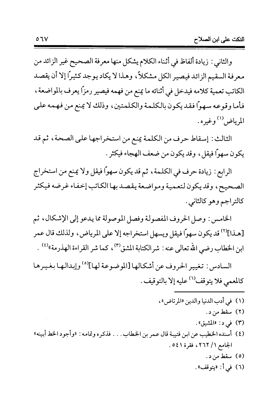 الْخَامِس وصل الْحُرُوف المفصولة وَفصل الموصولة مِمَّا يَدْعُو إِلَى الْإِشْكَال ثمَّ [هَذَا] (2) قد يكون سَهوا فيقل ويسهل استخراجه إِلَّا على المرياض وَلذَلِك قَالَ عمر ابْن الْخطاب رَضِي الله تَعَالَى عَنهُ شَرّ الْكِتَابَة الْمشق (3) كَمَا شَرّ الْقِرَاءَة الْهَذْرَمَةُ (4)