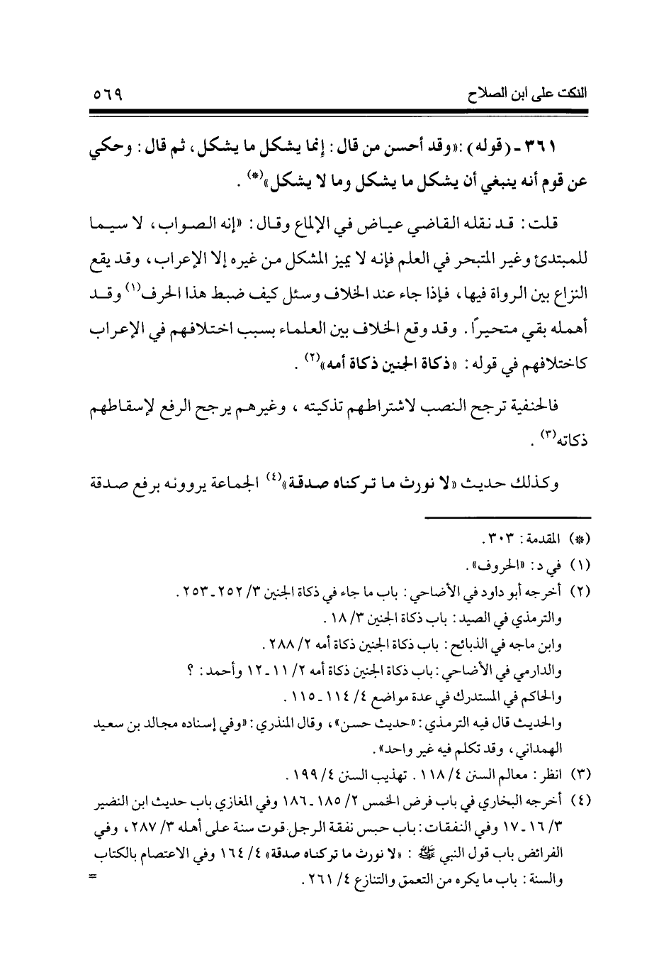 361 - (قَوْله) وَقد أحسن من قَالَ إِنَّمَا يشكل مَا يشكل ثمَّ قَالَ وَحكي عَن قوم أَنه يَنْبَغِي أَن يشكل مَا يشكل وَمَا لَا يشكل (3 4 5 6 7 8 لَا نورث مَا تَرَكْنَاهُ صَدَقَة (4) الْجَمَاعَة يَرْوُونَهُ بِرَفْع صَدَقَة