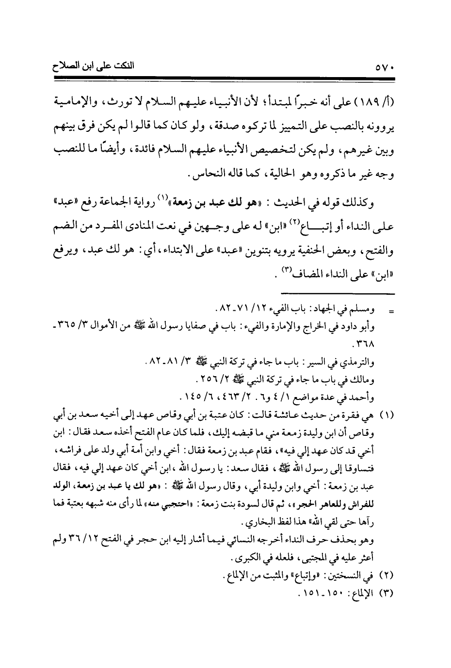 وَكَذَلِكَ قَوْله فِي الحَدِيث هُوَ لَك عبد بن زَمعَة (1) رِوَايَة الْجَمَاعَة رفع عبد على النداء أَو إتباع ابْن لَهُ على وَجْهَيْن فِي نعت المنادى الْمُفْرد من الضَّم وَالْفَتْح وَبَعض الْحَنَفِيَّة يرويهِ بتنوين عبد على الِابْتِدَاء أَي هُوَ لَك عبد وَيرْفَع ابْن على النداء الْمُضَاف (3)