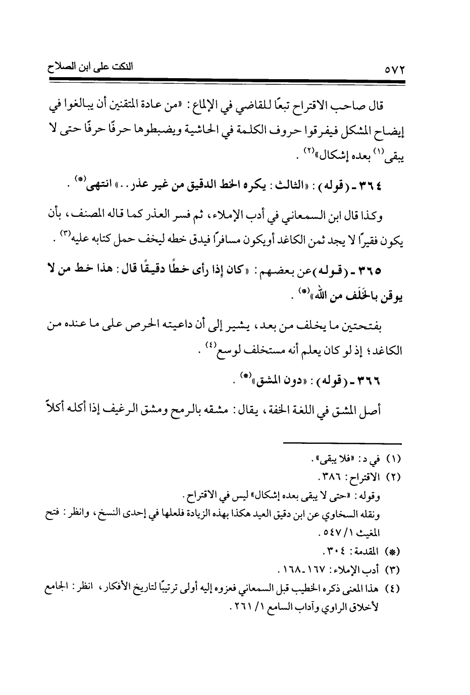 قَالَ صَاحب الاقتراح تبعا للْقَاضِي فِي الإلماع من عَادَة المتقنين أَن يبالغوا فِي إِيضَاح الْمُشكل فيفرقوا حُرُوف الْكَلِمَة فِي الْحَاشِيَة ويضبطوها حرفا حرفا حَتَّى لَا يبْقى (1) بعده إِشْكَال (2)