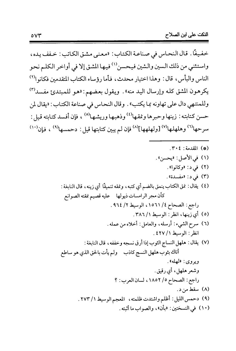 خَفِيفا قَالَ النّحاس فِي صناعَة الْكتاب معنى مشق الْكَاتِب خفف يَده واستثني من ذَلِك السِّين والشين فَيحسن (1) فِيهَا الْمشق إِلَّا فِي أَوَاخِر الْكَلم نَحْو النَّاس والبأس قَالَ وَهَذَا اخْتِيَار مُحدث فاما رُؤَسَاء الْكتاب الْمُتَقَدِّمين فَكَانُوا (2) يكْرهُونَ الْمشق كُله وإرسال الْيَد مِنْهُ وَيَقُول بَعضهم هُوَ للمبتدئ مُفسد (3) وللمنتهي دَال على تهاونه بِمَا يكْتب وَقَالَ النّحاس فِي صناعَة الْكتاب يُقَال لمن حسن كِتَابَته زينها وحبرها ونمقها (4) وذهبها وريشها (5) فَإِن أفسد كِتَابَته قيل سرحها (6) وهلهلها (7) [ولهلهها] (8) فَإِن لم يبين كتَابَتهَا قيل دحمسها (9) فَإِن (10)