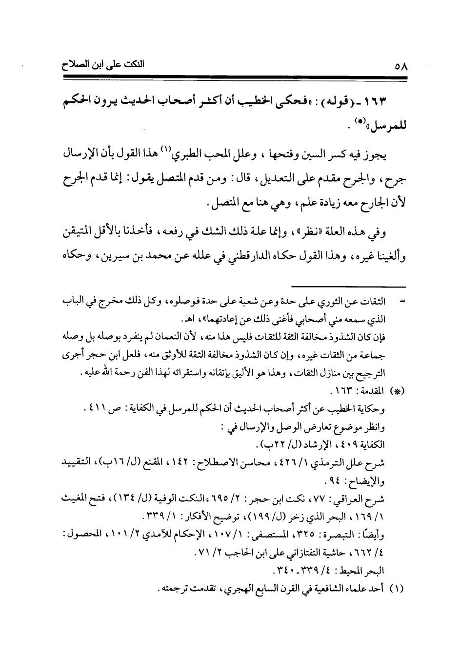 163 - (قَوْله) فَحكى الْخَطِيب أَن أَكثر أَصْحَاب الحَدِيث يرَوْنَ الحكم للمرسل