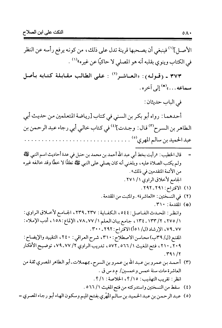 373 - (قَوْله) الْعَاشِر (2) على الطَّالِب مُقَابلَة كِتَابه بِأَصْل سَمَاعه (4 5 6 الْمهرِي (5)