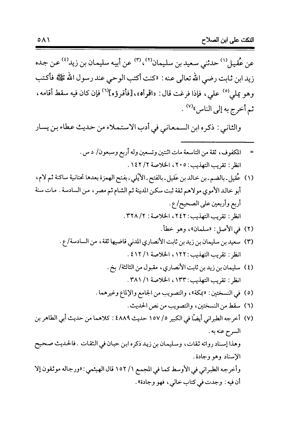 عَن عقيل (1) حَدثنِي سعيد بن سُلَيْمَان (2) (3) عَن أَبِيه سُلَيْمَان بن زيد (4) عَن جده زيد ابْن ثَابت رَضِي الله تَعَالَى عَنهُ كنت أكتب الْوَحْي عِنْد رَسُول الله صلى الله عَلَيْهِ وَسلم فأكتب وَهُوَ يملي (5) عَليّ فَإِذا فرغت قَالَ اقرأه [فأقرؤه] (6) فَإِن كَانَ فِيهِ سقط أَقَامَهُ ثمَّ أخرج بِهِ إِلَى النَّاس (7)