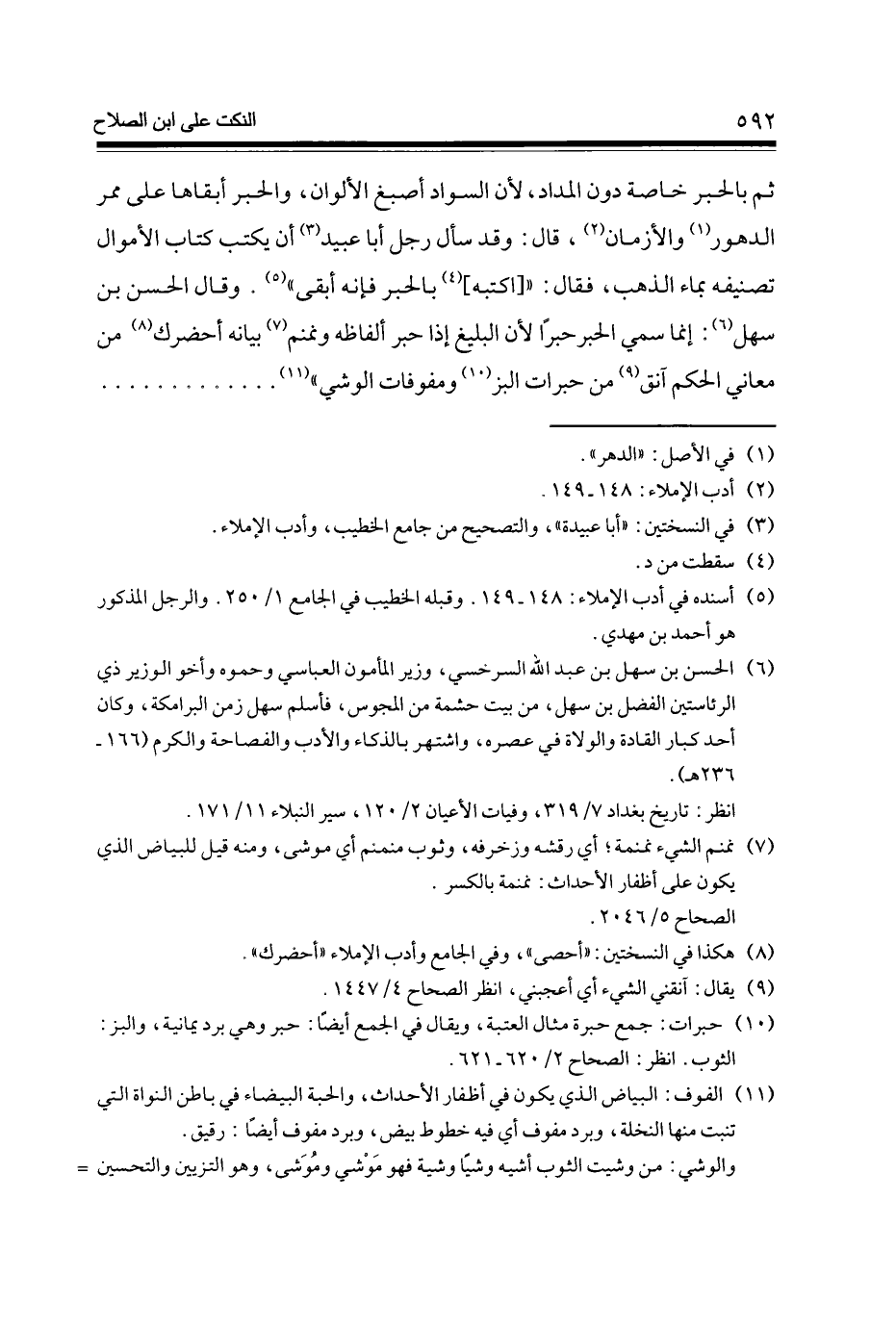 ثمَّ بالحبر خَاصَّة دون المداد لِأَن السوَاد اصبغ الألوان والحبر أبقاها على ممر الدهور (1) والأزمان (2) قَالَ وَقد سَأَلَ رجل أَبَا عبيد (3) أَن يكْتب كتاب الْأَمْوَال تصنيفه بِمَاء الذَّهَب فَقَالَ [اكتبه] (4) بالحبر فَإِنَّهُ أبقى (5) وَقَالَ الْحسن بن سهل (6) إِنَّمَا سمي الحبر حبرًا لِأَن البليغ إِذا حبر الفاظه ونمنم (7) بَيَانه أحضرك (8) من مَعَاني الحكم آنق (9) من حبرات الْبَز (10) ومفوفات الوشي (11)
