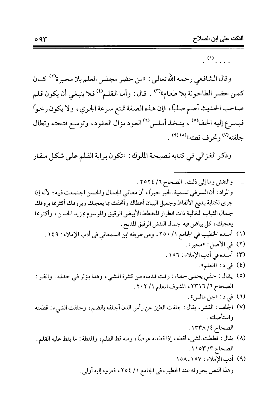 وَقَالَ الشَّافِعِي رَحمَه الله تَعَالَى من حضر مجْلِس الْعلم بِلَا محبرة (2) كَانَ كمن حضر الطاحونة بِلَا طَعَام (3) قَالَ وَأما الْقَلَم (4) فَلَا يَنْبَغِي أَن يكون قلم صَاحب الحَدِيث أَصمّ صلبا فَإِن هَذِه الصّفة تمنع سرعَة الجري وَلَا يكون رخوا فيسرع إِلَيْهِ الحفا (5) يتَّخذ أملس (6) الْعود مزال الْعُقُود وَتوسع فَتحته وتطال جلفته (7) وتحرف قطته (8) (9)