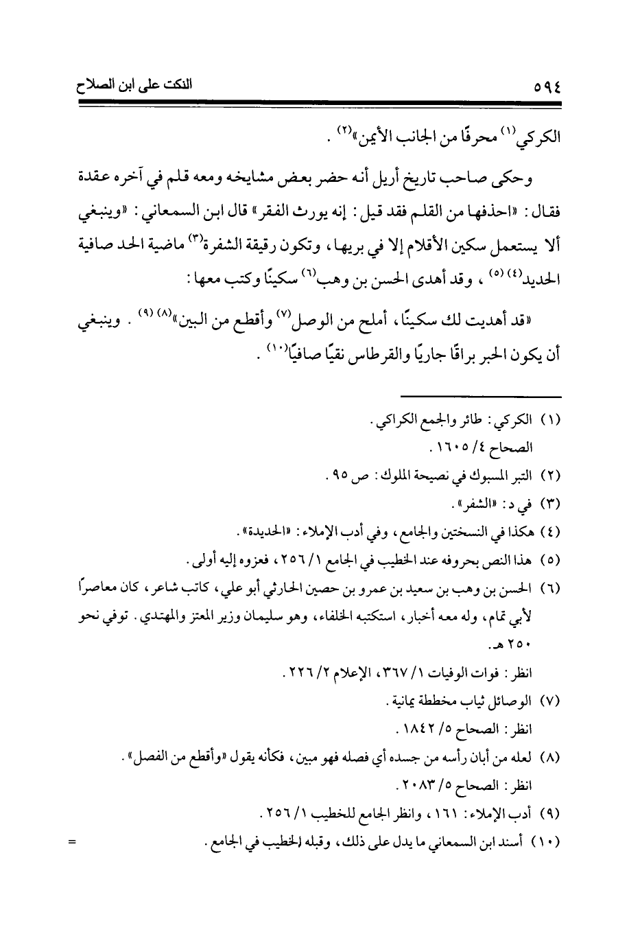 وَحكى صَاحب تَارِيخ أريل أَنه حضر بعض مشايخه وَمَعَهُ قلم فِي آخِره عقدَة فَقَالَ احذفها من الْقَلَم فقد قيل إِنَّه يُورث الْفقر قَالَ ابْن السَّمْعَانِيّ وَيَنْبَغِي أَلا يسْتَعْمل سكين الأقلام إِلَّا فِي بريها وَتَكون رقيقَة الشَّفْرَة (3) مَاضِيَة الْحَد صَافِيَة الْحَدِيد (4) (5) وَقد أهْدى الْحسن بن وهب (6) سكينا وَكتب مَعهَا