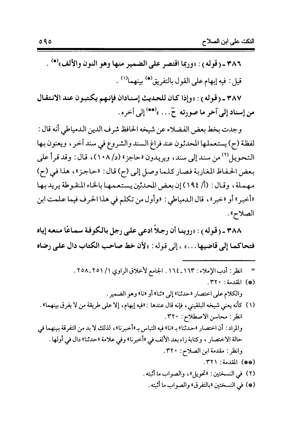 وجدت بِخَط بعض الْفُضَلَاء عَن شَيْخه الْحَافِظ شرف الدّين الدمياطي أَنه قَالَ لَفْظَة (ح) يستعملها المحدثون عِنْد فرَاغ السَّنَد والشروع فِي سَنَد آخر ويعنون بهَا التَّحْوِيل (2) من سَنَد إِلَى سَنَد ويريدون حاجز (د / 108) قَالَ وَقد قَرَأَ على بعض الْحفاظ المغاربة فَصَارَ كلما وصل إِلَى (ح) قَالَ حاجز هَذَا فِي (ح) مُهْملَة وَقَالَ (أ / 194) إِن بعض الْمُحدثين يستعمها بِالْخَاءِ المنقوطة يُرِيد بهَا أخبر أَو خبر قَالَ الدمياطي وَأول من تكلم فِي هَذَا الْحَرْف فِيمَا علمت ابْن الصّلاح