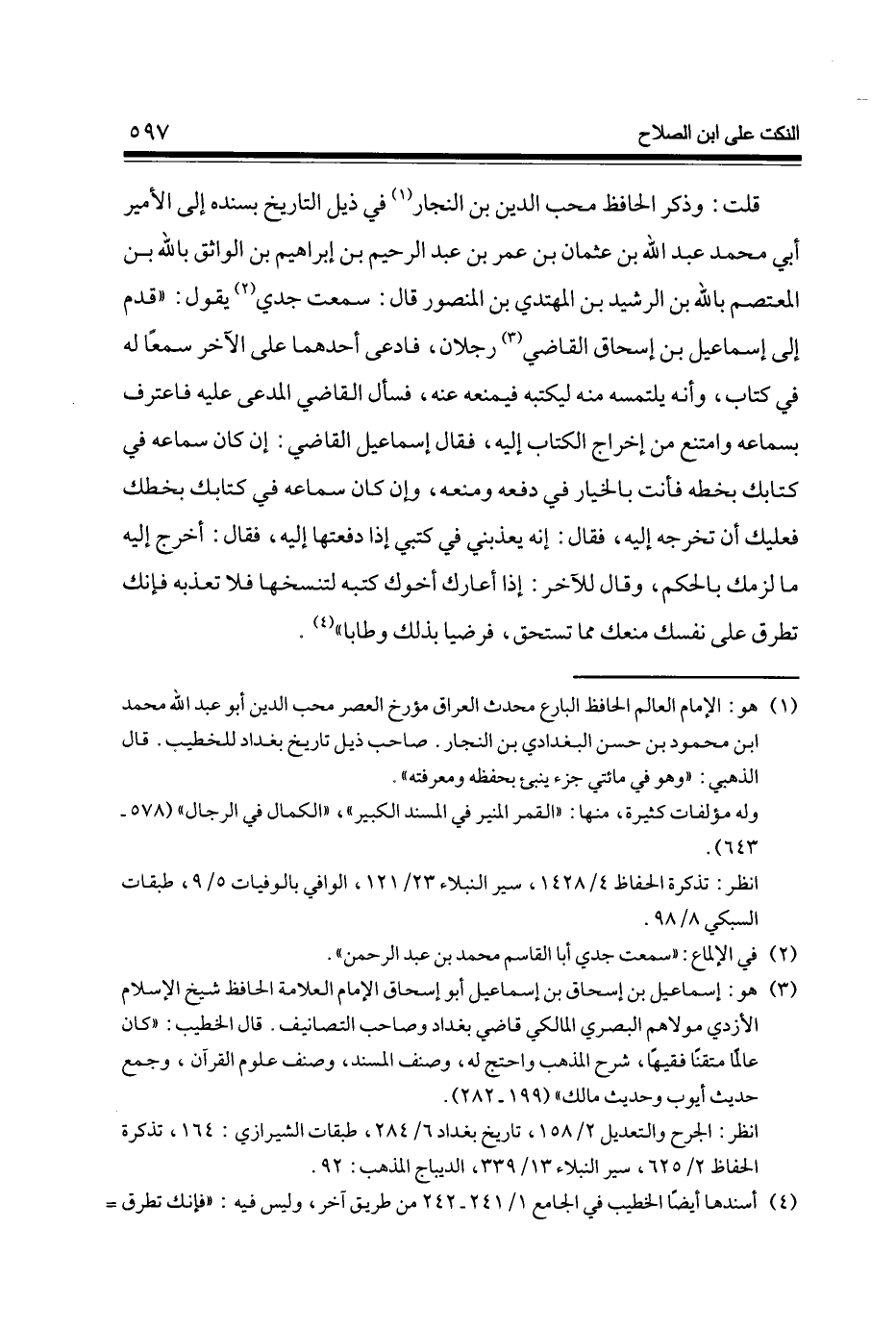 قلت وَذكر الْحَافِظ محب الدّين بن النجار (1) فِي ذيل التَّارِيخ بِسَنَدِهِ إِلَى الْأَمِير أبي مُحَمَّد عبد الله بن عُثْمَان بن عمر بن عبد الرَّحِيم بن إِبْرَاهِيم بن الواثق بِاللَّه بن المعتصم بِاللَّه بن الرشيد بن الْمُهْتَدي بن الْمَنْصُور قَالَ سَمِعت جدي (2) يَقُول قدم إِلَى إِسْمَاعِيل بن إِسْحَاق القَاضِي (3) رجلَانِ فَادّعى أَحدهمَا على الاخر سمعا لَهُ فِي كتاب وَأَنه يلتمسه مِنْهُ ليكتبه فيمنعه عَنهُ فَسَأَلَ القَاضِي الْمُدعى عَلَيْهِ فاعترف بِسَمَاعِهِ وَامْتنع من إِخْرَاج الْكتاب إِلَيْهِ فَقَالَ إِسْمَاعِيل القَاضِي إِن كَانَ سَمَاعه فِي كتابك بِخَطِّهِ فَأَنت بِالْخِيَارِ فِي دَفعه وَمنعه وَإِن كَانَ سَمَاعه فِي كتابك بخطك فَعَلَيْك أَن تخرجه إِلَيْهِ فَقَالَ إِنَّه يُعَذِّبنِي فِي كتبي إِذا دفعتها إِلَيْهِ فَقَالَ أخرج إِلَيْهِ مَا لزمك بالحكم وَقَالَ للْآخر إِذا أعارك أَخُوك كتبه لتنسخها فَلَا تعذبه فَإنَّك تطرق على نَفسك مَنعك مِمَّا تسْتَحقّ فرضيا بذلك وطابا (4)