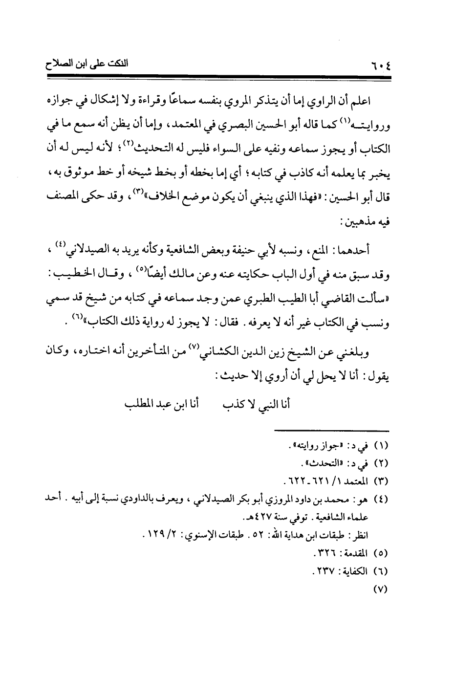 أعلم أَن الرَّاوِي إِمَّا أَن يتَذَكَّر الْمَرْوِيّ بِنَفسِهِ سَمَاعا وَقِرَاءَة وَلَا إِشْكَال فِي جَوَازه وَرِوَايَته (1) كَمَا قَالَه أَبُو الْحُسَيْن الْبَصْرِيّ فِي الْمُعْتَمد وَإِمَّا أَن يظنّ أَنه سمع مَا فِي الْكتاب أَو يجوز سَمَاعه ونفيه على السوَاء فَلَيْسَ لَهُ التحديث (2) لِأَنَّهُ لَيْسَ لَهُ أَن يخبر بِمَا يُعلمهُ أَنه كَاذِب فِي كِتَابه أَي إِمَّا بِخَطِّهِ أَو بِخَط شَيْخه أَو خطّ موثوق بِهِ قَالَ أَبُو الْحُسَيْن فَهَذَا الَّذِي يَنْبَغِي أَن يكون مَوضِع الْخلاف (3) وَقد حكى المُصَنّف فِيهِ مذهبين