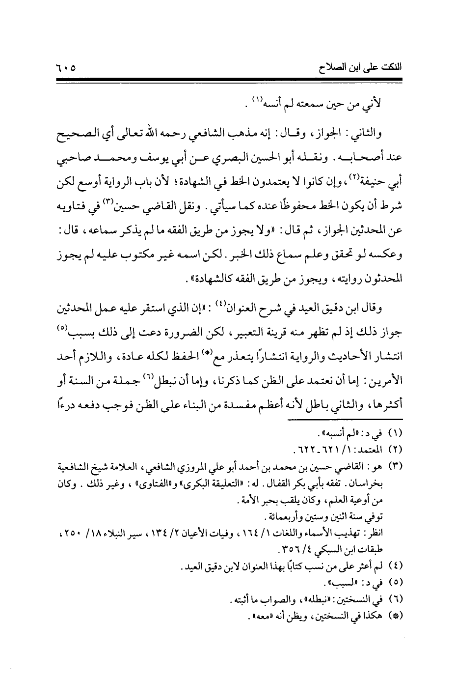 وَالثَّانِي الْجَوَاز وَقَالَ إِنَّه مَذْهَب الشَّافِعِي رَحمَه الله تَعَالَى أَي الصَّحِيح عِنْد أَصْحَابه وَنَقله أَبُو الْحُسَيْن الْبَصْرِيّ عَن أبي يُوسُف وَمُحَمّد صَاحِبي أبي حنيفَة (2) وَإِن كَانُوا لَا يعتمدون الْخط فِي الشَّهَادَة لِأَن بَاب الرِّوَايَة أوسع لَكِن شَرط أَن يكون الْخط مَحْفُوظًا عِنْده كَمَا سَيَأْتِي وَنقل القَاضِي حُسَيْن (2) فِي فَتَاوِيهِ عَن الْمُحدثين الْجَوَاز ثمَّ قَالَ وَلَا يجوز من طَرِيق الْفِقْه مَا لم يذكر سَمَاعه قَالَ وَعَكسه لَو تحقق وَعلم سَماع ذَلِك الْخَبَر لَكِن اسْمه غير مَكْتُوب عَلَيْهِ لم يجوز المحدثون رِوَايَته وَيجوز من طَرِيق الْفِقْه كَالشَّهَادَةِ